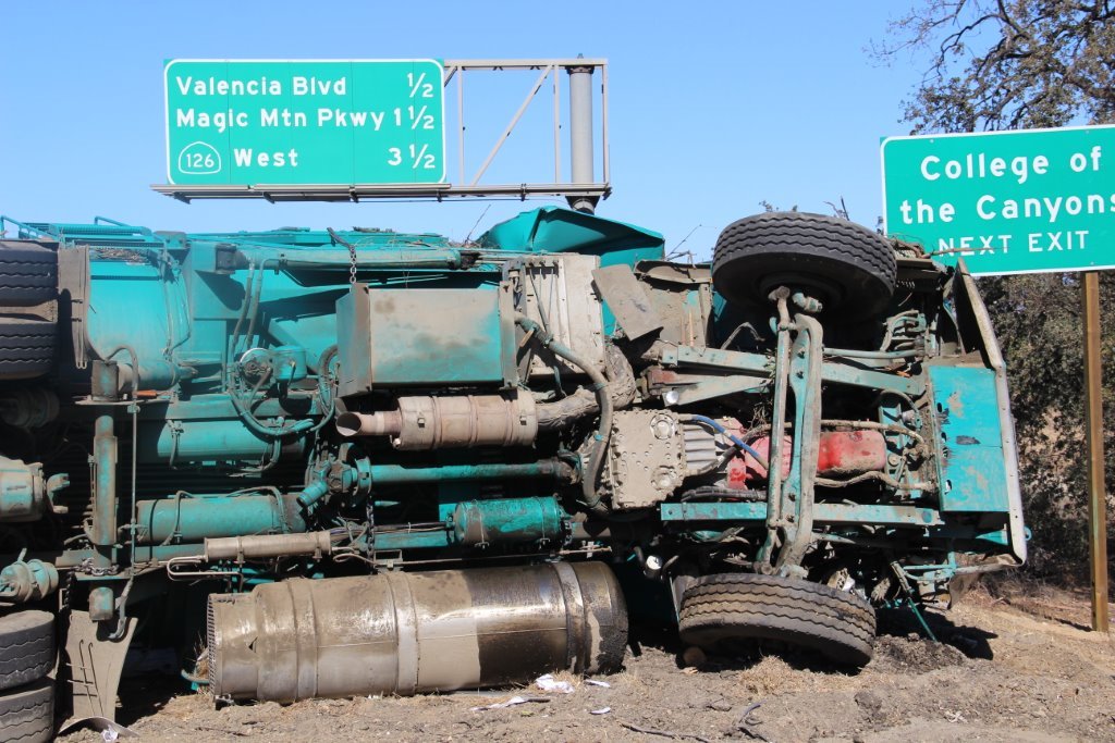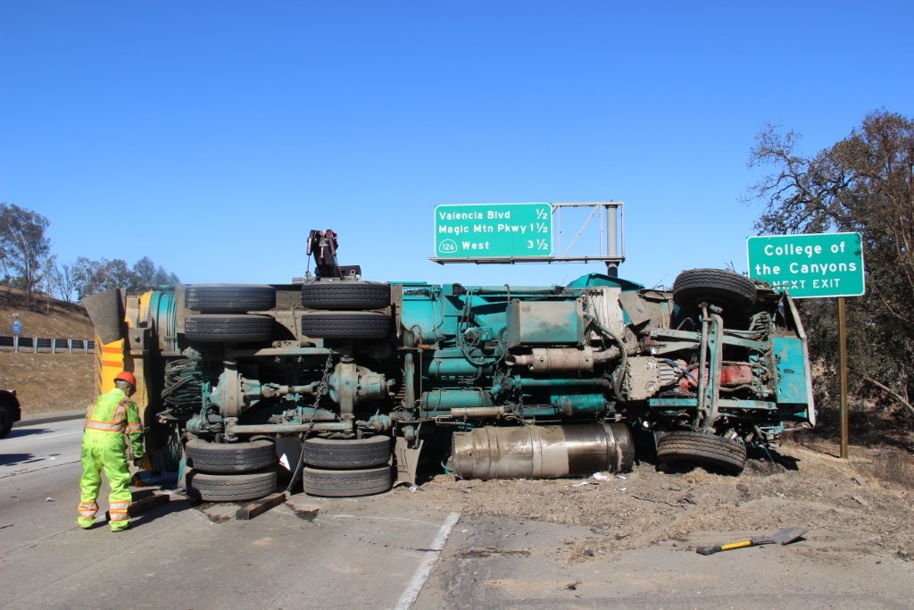A trash truck overturned on northbound Interstate 5 near Valencia Boulevard on Tuesday morning.
