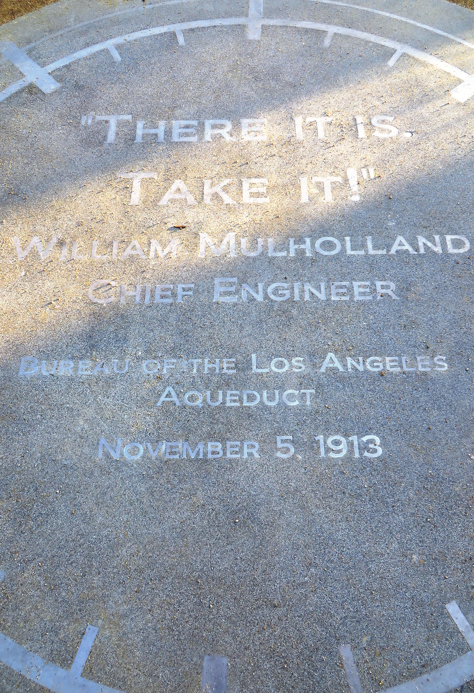 Uploaded 11/10/2013 The William Mulholland Memorial Fountain opened in 1940 at Los Feliz and Riverside Drive as a tribute to the man who siphoned water from the Owens Valley to feed a thirsty Los Angeles as the 20th Century dawned. Mulholland is hailed as a hero in that city; never do L.A. City officials acknowledge that the same brilliant LADWP engineer who designed the original 230-mile, gravity-fed Los Angeles Aqueduct also designed and built the ill-fated St. Francis Dam in San Francisquito Canyon. A cog in the wheel of the aqueduct system, the dam killed an estimated 450 people from Saugus to the sea when it collapsed March 12, 1928. As a further tribute to mark the 100th anniversary of the aqueduct’s completion, L.A. city and water officials unveiled the new L.A. Aqueduct Centennial Garden at the site of the fountain on Oct. 23, 2013. A walkable art installation, the garden includes a curb in the shape of the aqueduct, with mile markers denoting the eventual 340-mile length of the pipeline from Mono Lake to the Cascades at Sylmar, which are represented by little steps at the end of the curb. The steps open onto an inscription in concrete bearing Mulholland’s words when the water flowed down the Cascades for the first time: “There it is; take it.” A small, round piece of steel in the appropriate place on the timeline reads “SAUGUS,” apparently denoting the two power plants in San Francisquito Canyon. Nearby is a riveted section of 8-foot-tall pipe. One thing that’s missing is any acknowledgment of the 450 Santa Clarita Valley and Ventura County residents who paid for L.A.’s growth with their lives – without the benefit of receiving any of L.A.’s water. |