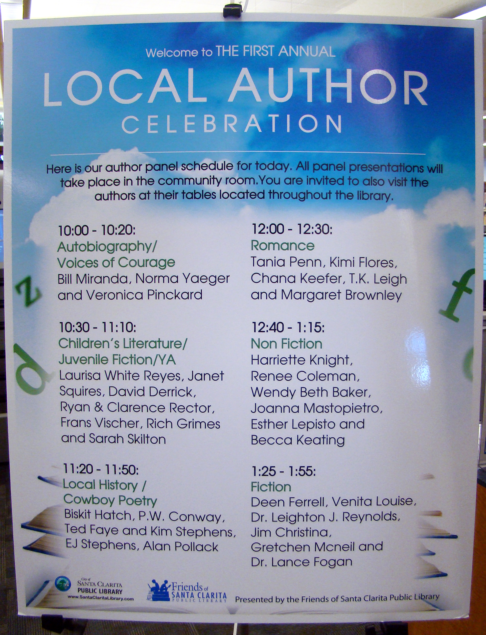 Uploaded 01/18/2014 Members of the public had a chance to meet and chat with nearly three dozen local authors Saturday at the Canyon Country Jo Anne Darcy Library. The “Celebration of Local Authors” was sponsored by the Friends of Santa Clarita Public Library. The authors also participated in panel discussions focusing on autobiography, juvenile fiction, local history, romance and nonfiction, and other topics. Participating authors included: Autobiography/Voices of Courage * Bill Miranda * Norma Yeager * Veronica Pinckard Children’s Literature/Juvenile Fiction/YA * Laurisa White Reyes * Janet Squires * David Derrick * Ryan and Clarence Rector * Frans Vischer * Rich Grimes * Sarah Skilton Local History & Cowboy Poetry * Biskit Hatch * P.W. Conway * Ted Fay * Kim Stephens, E.J. Stephens and Dr. Alan Pollack Romance * Tania Penn * Kimi Flores * Chana Keefer * T.K. Leigh * Margaret Brownley Non-Fiction * Harriette Knight * Renee Coleman * Wendy Beth Baker * Joanna Mastopietro * Esther Lepisto * Becca Keating Fiction * Deen Ferrell * Venita Louise * Dr. Leighton J. Reynolds * Jim Christina * Gretchen Mcneil * Dr. Lance Fogan How-To * Rhonda Vigeant About Friends of the Library The Friends of Santa Clarita Library is a group of volunteers dedicated to the success of the Santa Clarita library system. Since its inception in 2011, FOL has supported the grand opening of the Newhall Branch, provided funds and volunteered for children and adult programming, including story times and classes. They organize and sponsor author events, watercolor classes, ARTSLAM activities, and more. |