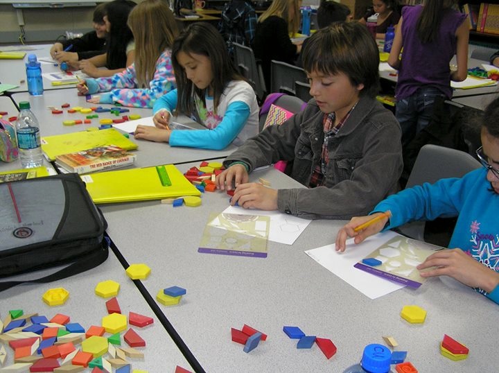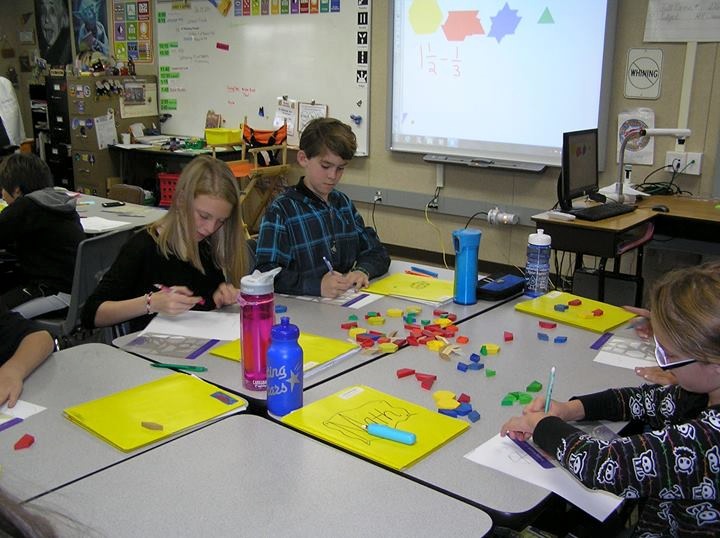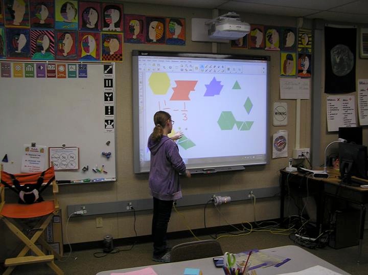 Meadows School fifth grade students from Mrs. Dobry’s class are learning the Common Core approach to fraction subtraction using pattern blocks and a new SMART interactive whiteboard, installed thanks to Measure E bond funds.
