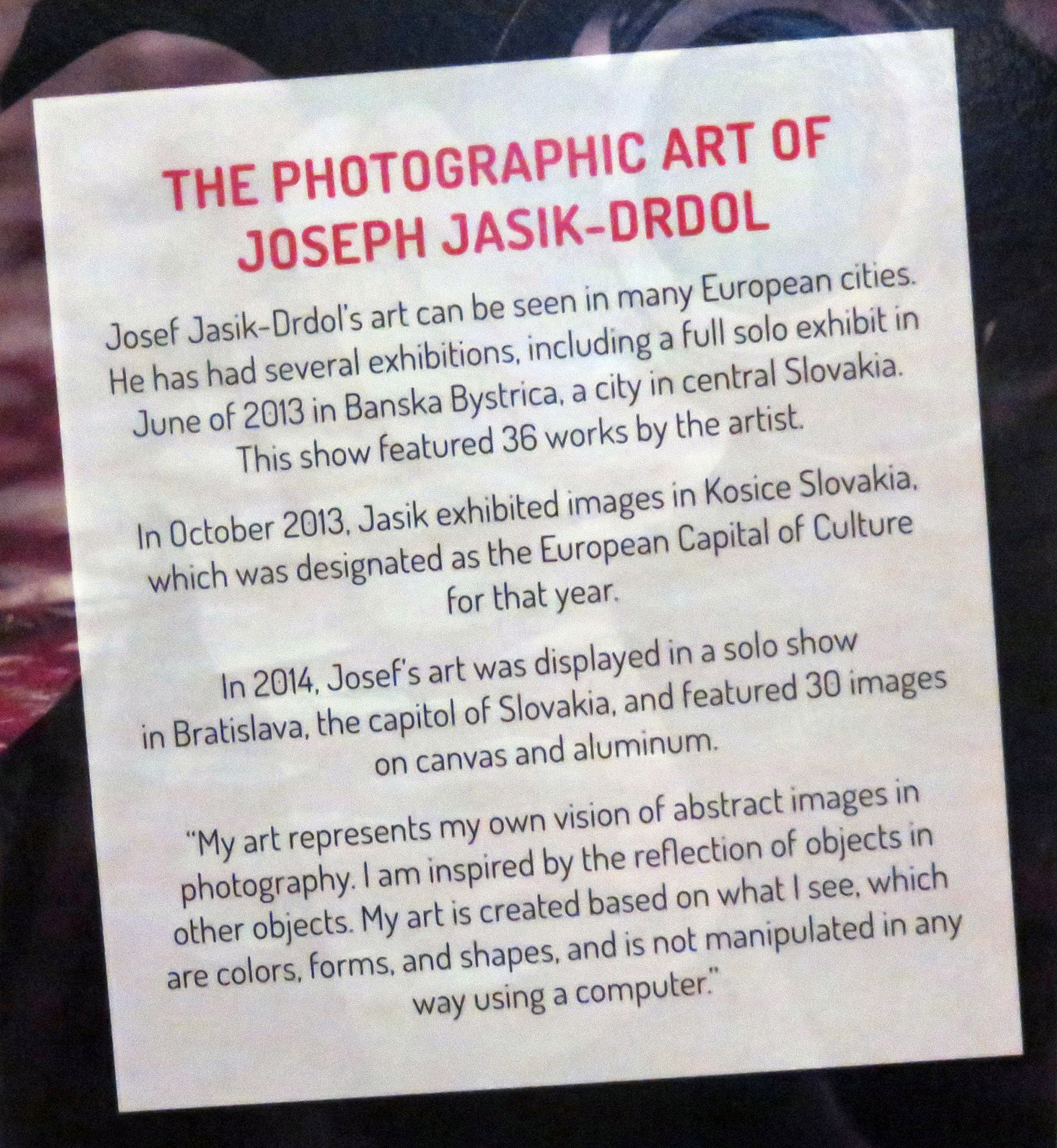 Uploaded 11/07/2015 The photographic art of Joseph Jasik-Drdol is now on display in the Old Town Newhall Library Community Room, where a reception was held Nov. 4. Jasik-Drdol’s art can be viewed in many cities across Europe where he’s had several exhibitions. He was featured in a solo exhibit in June 2013 in Banska Bystrica in central Slovakia. This particular show featured 36 works by the artist. Later that year, Jasik-Drdol was featured in the 2013 European Capital of Culture in Kosice, Slovakia. Last year, Jasik-Drdol’s art was displayed in a solo show in Bratislava, the capital of Slovakia and featured 30 images on canvas and aluminum. “My art represents my own vision of abstract images in photography,” Jasik-Drdol said. “I am inspired by the reflection of objects in other objects. My art is created based on what I see, which are colors, forms and shapes and is not manipulated in anyway using a computer.” The Santa Clarita public can view his photographs at the Old Town Newhall Library in the Community Room until Feb. 15, 2016.