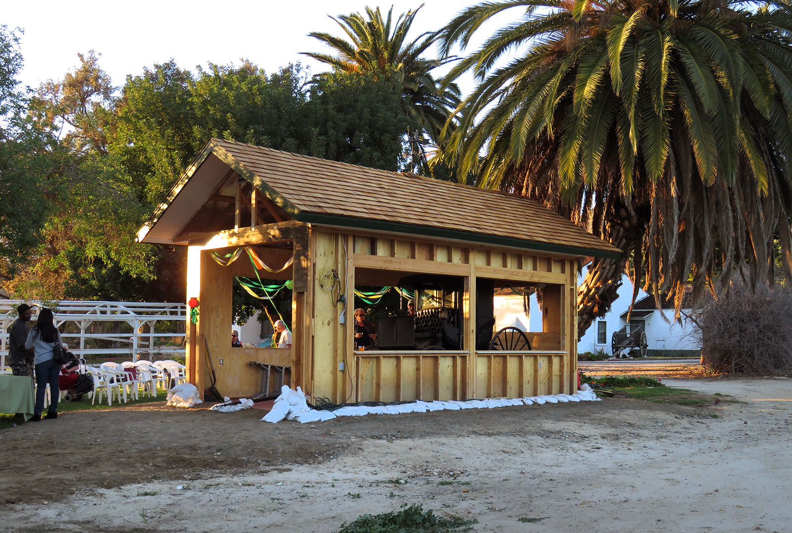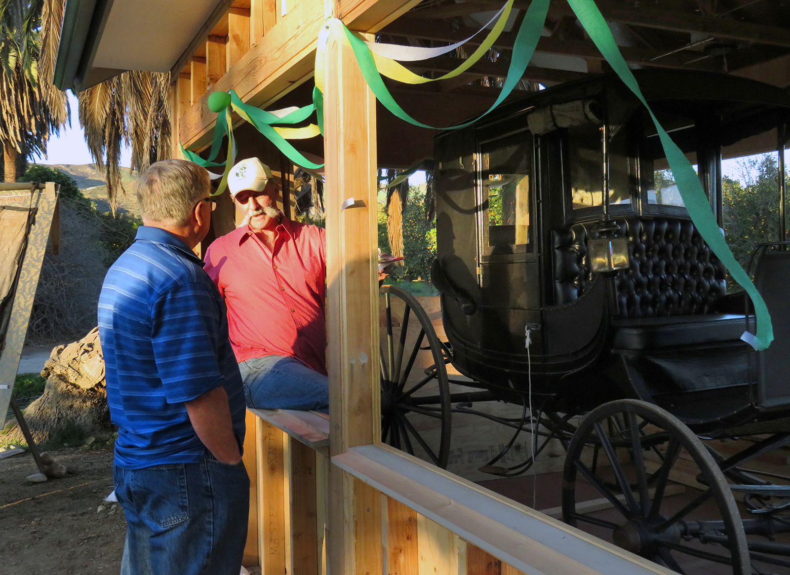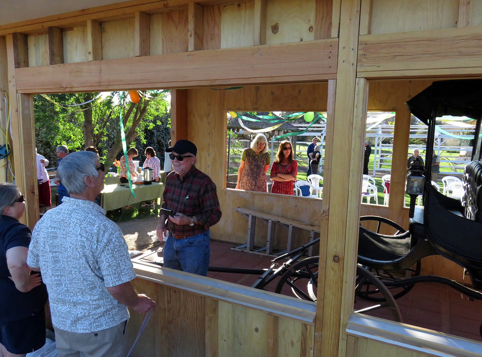 Uploaded 02/21/2016 The new, two-horse buggy that the Del Valle family purchased in 1861 and brought around Cape Horn to their 48,000-acre Rancho San Francisco (aka the Santa Clarita Valley) was in sad shape when Rancho Camulos Museum volunteer Ralph Rees and his wife Pat took it upon themselves to restore it to its former glory in 2009. Recently, Ralph came up with the idea of building a carriage house with a 270-degree view so the buggy could be seen, appreciated and protected. Ralph designed the carriage house and managed a group of fellow volunteers who helped him build it on the museum grounds (10 miles west of Valencia on scenic Highway 126). The new carriage house is nearly complete; a pecan tree that fell on the ranch property last year will provide lumber for the exterior siding. On Sunday the buggy was rolled into the new carriage house for a formal dedication. The event doubled as a celebration of Ralph’s 90th birthday. – Leon Worden |