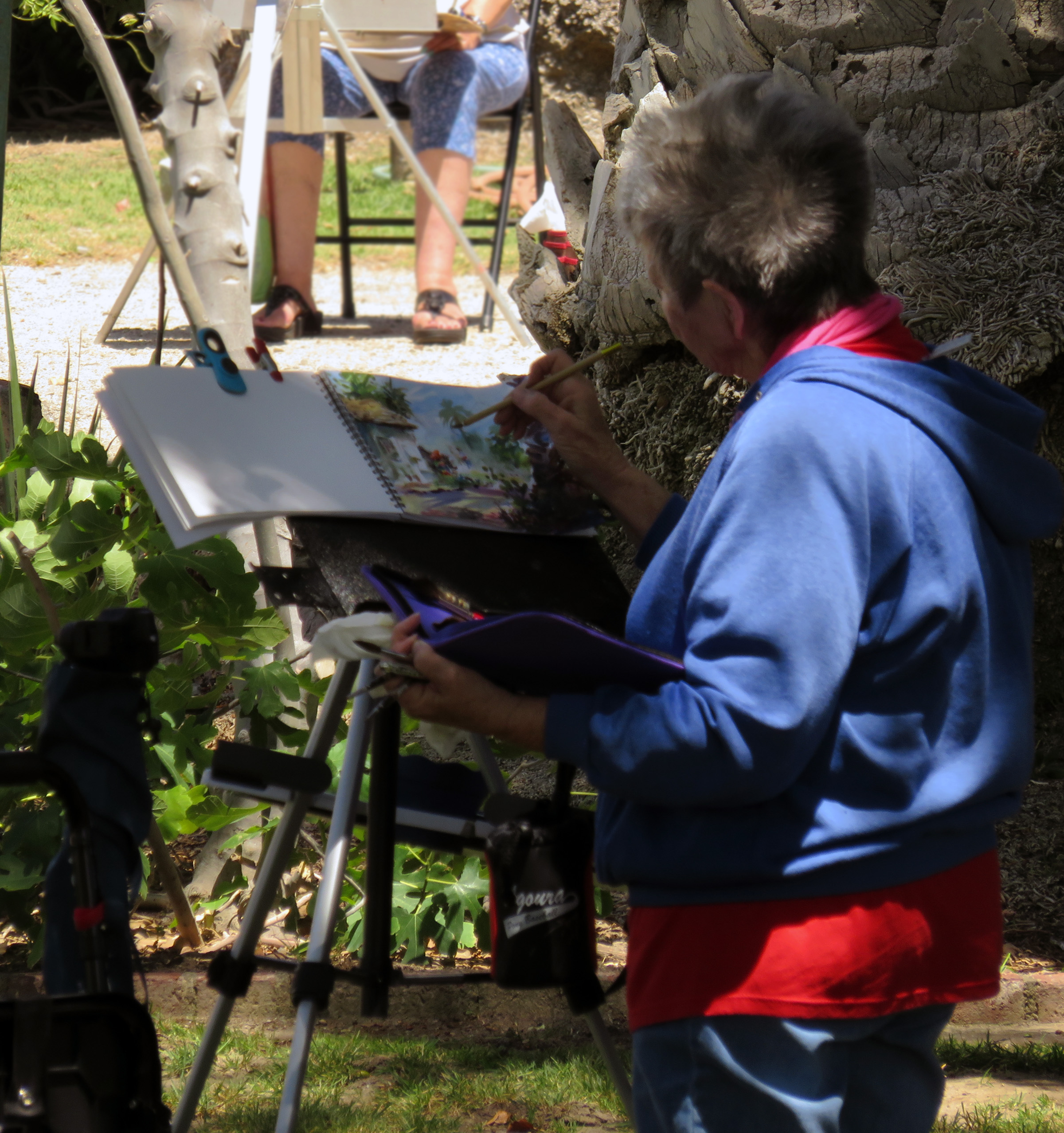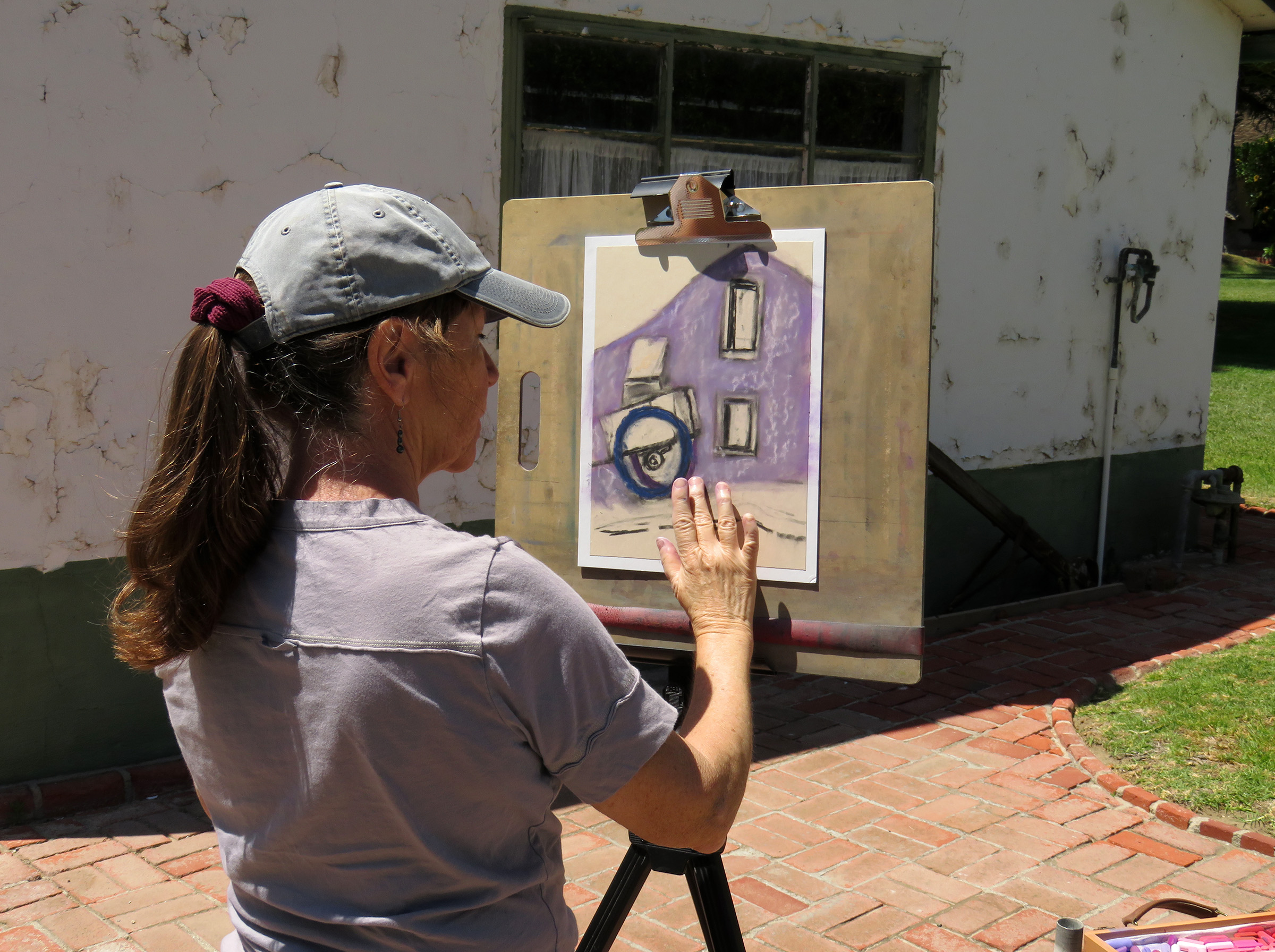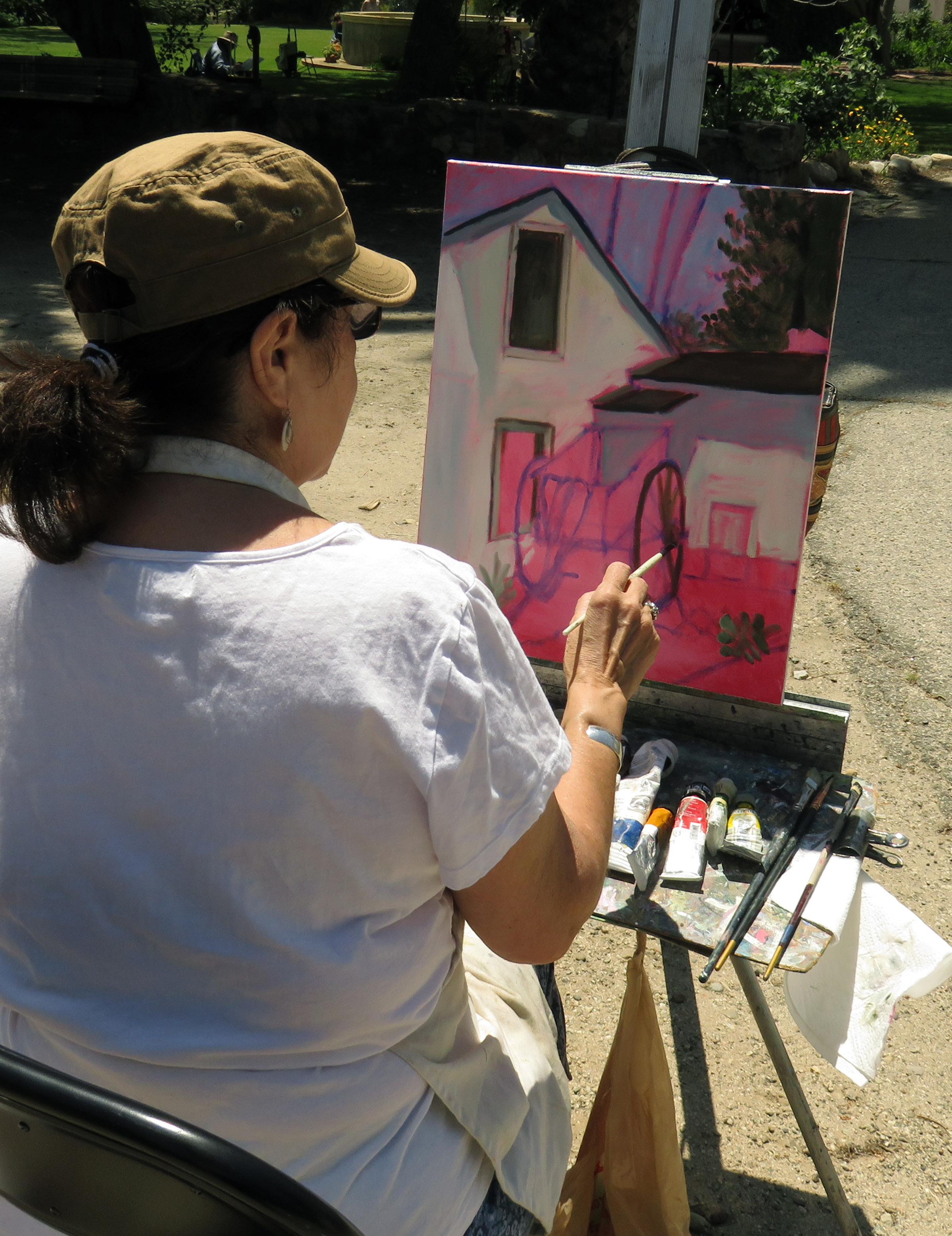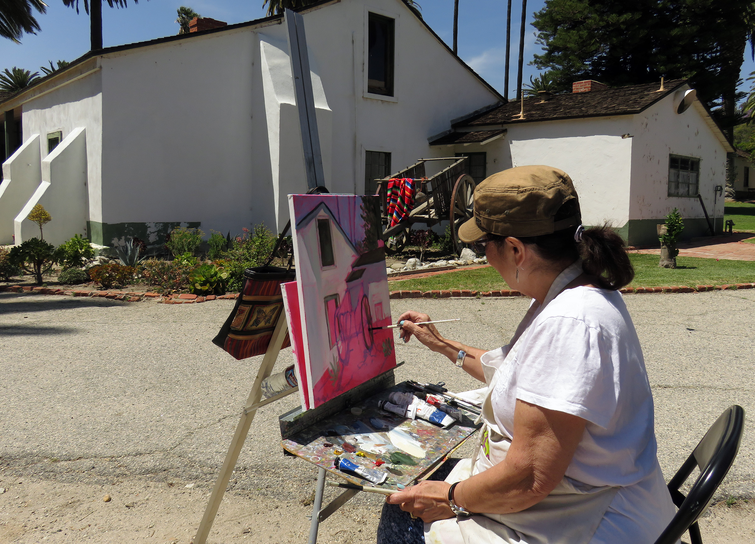 Uploaded 05/15/2016 Rancho Camulos, garden spot of the Santa Clarita Valley, known as the “Home of Ramona” and an idyllic location for a wedding, was turned into an artist’s tableau Saturday as plein-air painters participated in the annual Artists Day at the historic California rancho. A pleasant spring breeze accentuated the views of the 1853 adobe home of the Del Valle family, as well as the famous rose gardens, the 1867 winery building, the chapel, and the schoolhouse built in 1930 by the rancho’s second owner, August Rübel. Artists spread themselves throughout the grounds of the Rancho Camulos Museum and were treated to lunch and guided tours by museum docents. Open for public viewing on Sundays, Rancho Camulos Museum is located 10 miles west of Valencia on scenic Highway 126. For more information about Rancho Camulos, click here. For the history and old photos of the ranch, click here.