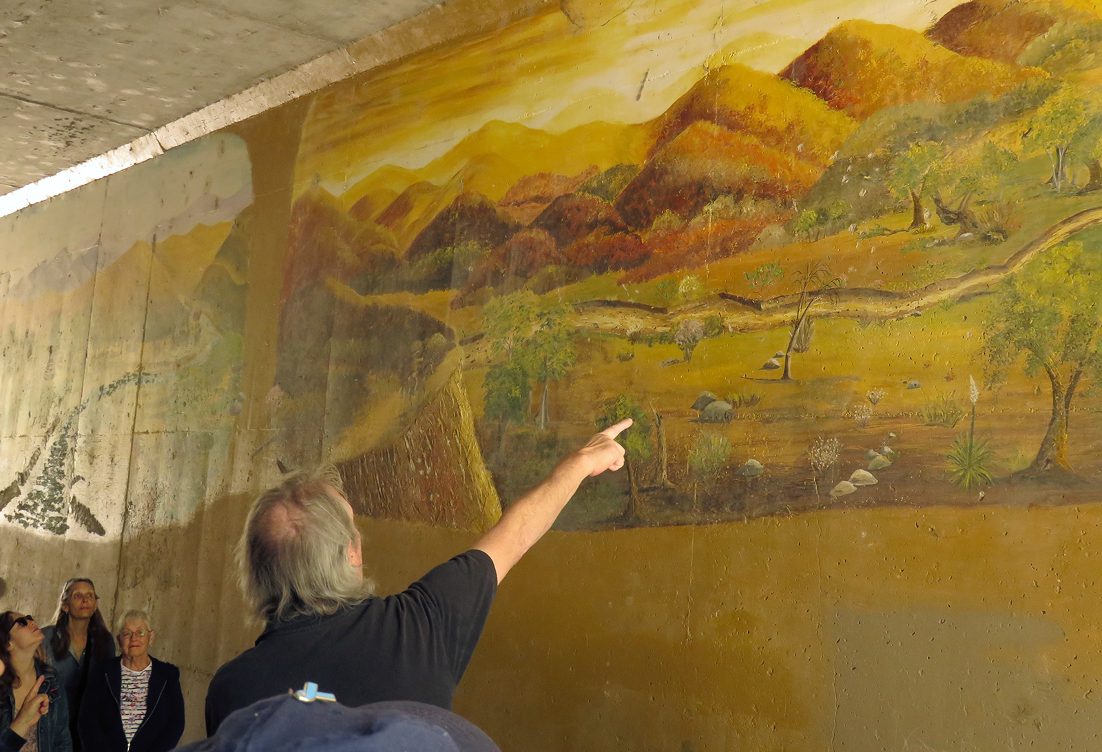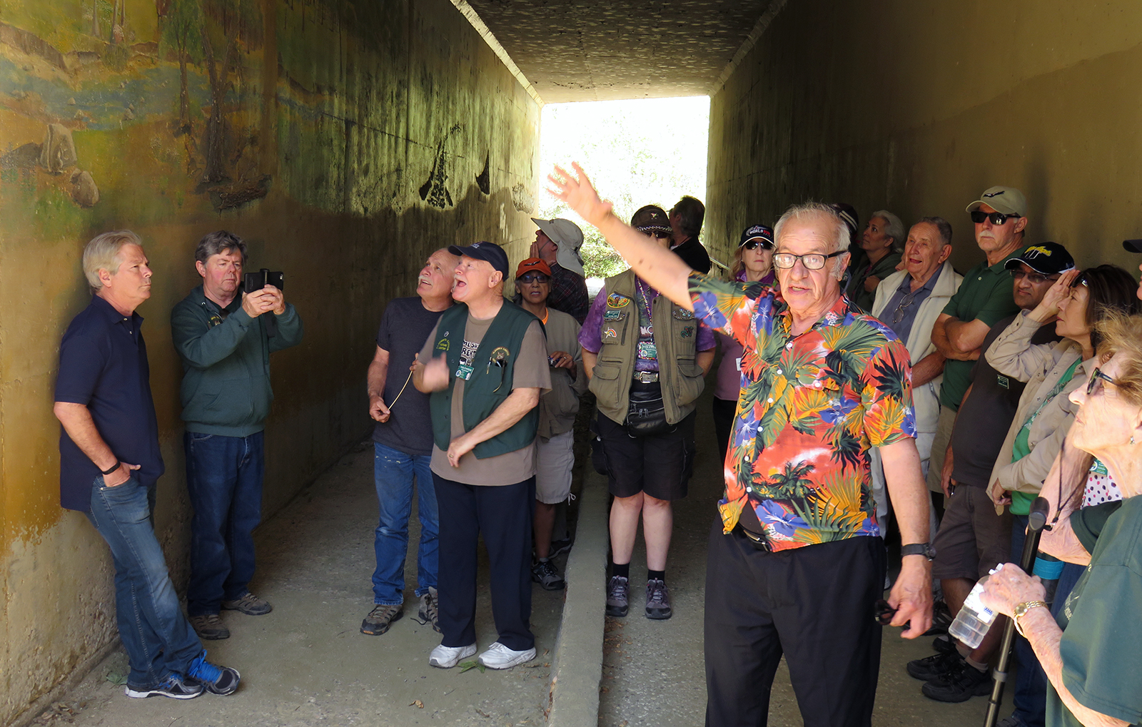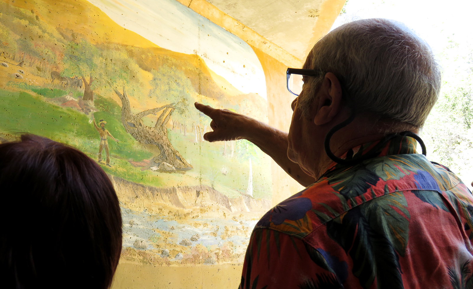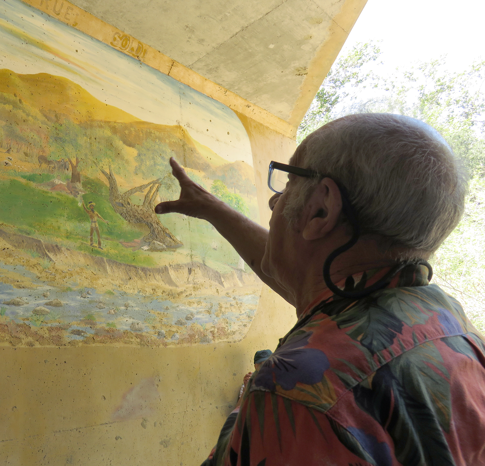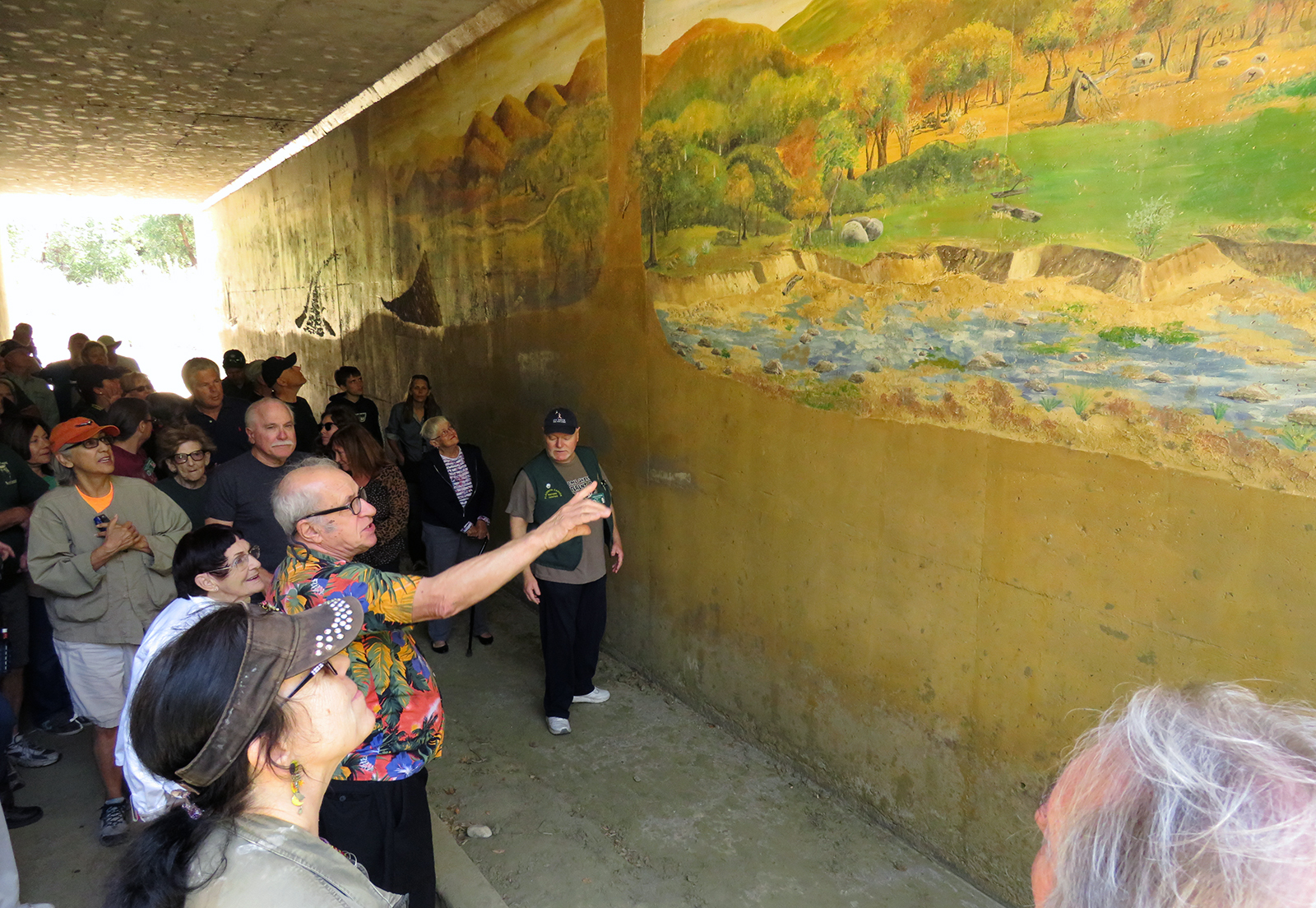 Uploaded 05/23/2016 Exactly 40 years after it was dedicated, the artist responsible for the mural next to the Oak of the Golden Dream returned to Placerita Canyon State Park to describe its features and explain how he did it. Rudolph “Rudy” Pavini, now 81, was working at the Placerita Canyon Nature Center as a naturalist when the Los Angeles County Parks Department persuaded him in 1976 to paint a mural on the walls of the flood-control channel where Placerita Canyon Road crosses Placerita Creek. The mural was to depict the history of the park. Pavini, who lives in Canyon Country, was neither a naturalist nor a historian by trade; he was an artist. Born in Massachusetts, Pavni attended art school in Boston and taught art for 25 years in elementary schools and after-school programs. So he researched the history of the area in the local library and decided to paint six panels, each representing a different point in history. Hiking along the trail from the Nature Center to the famous golden oak, viewers walk forward in time from pre-dawn of man through the arrival of Tataviam Indians, followed by the Spanish, Mexican and finally the American periods One of the best known features is Pavini’s depiction of Francisco Lopez and the nearby tree where legend tells us Lopez napped, dreamed of riches, and awoke to discover gold flakes clinging to the roots of some wild onions. A favorite among visiting schoolchildren is the last panel, which shows prospectors sitting around a morning campfire, preparing for another hard day’s work. It took Pavini three months to complete the mural, which was dedicated May 23, 1976. He said he was still leading schoolchildren on hikes while he worked on it; he occasionally enlisted their aid in painting lower portions of the mural while he worked on the upper portions, which required scaffolding. Addressing a group of several dozen Placerita Canyon Nature Center volunteers and county park staff members Monday, Pavini revealed some hidden secrets of the mural. Upon close inspection, the viewer will see that certain features are raised; Pavini used a polymer mixture with local sand to create the texture of the riverbed, and he used sawdust for the bark of the golden oak. Irregularities in pictures of boulders represent Native American petroglyphs, and the rider on horseback in a late-afternoon scene with a reddish orange sky is intended to be Francisco Lopez. By and large, the acrylic painting has withstood the ravages of time. Ranger Frank Hoffman said he has seen water to a 5-foot level in the channel during El Nino weather events, covering lower portions of the mural, which is only about three feet off the ground in certain places. Most of the mural is shielded from direct sunlight, and Pavini said he used a protective coating so it can be cleaned. For more information about the Placerita Canyon Nature Center, click here.