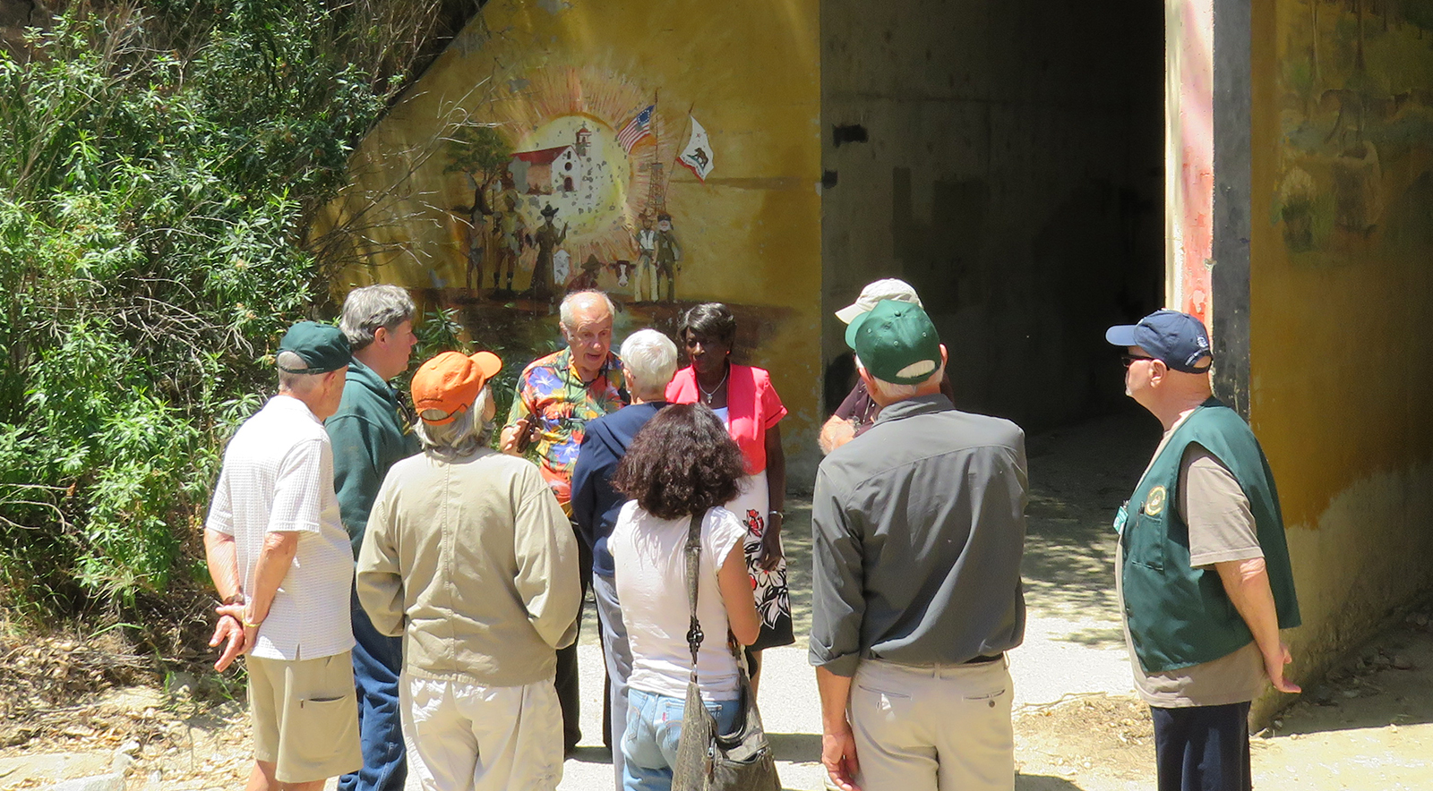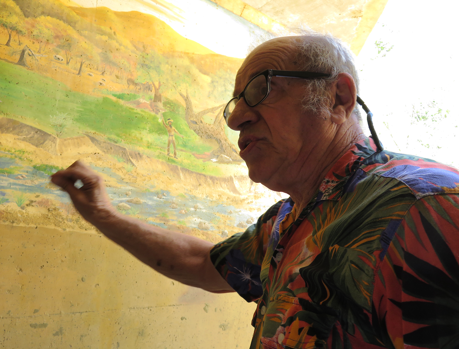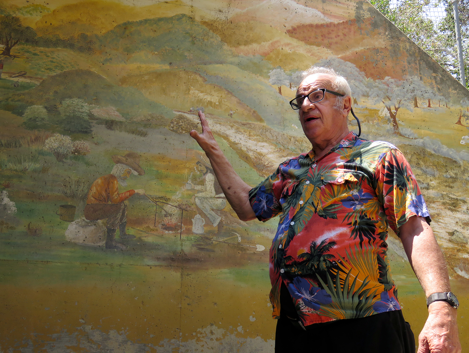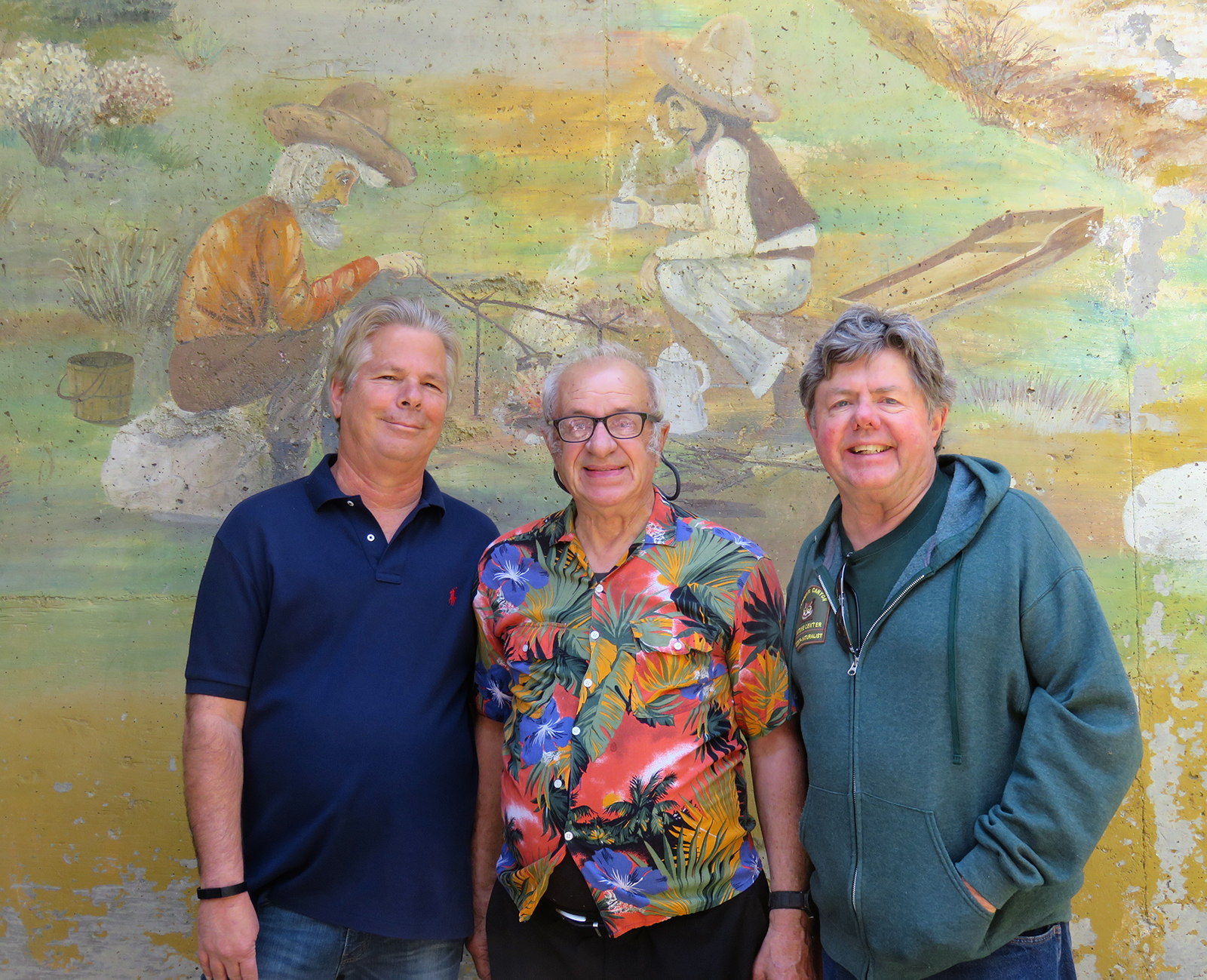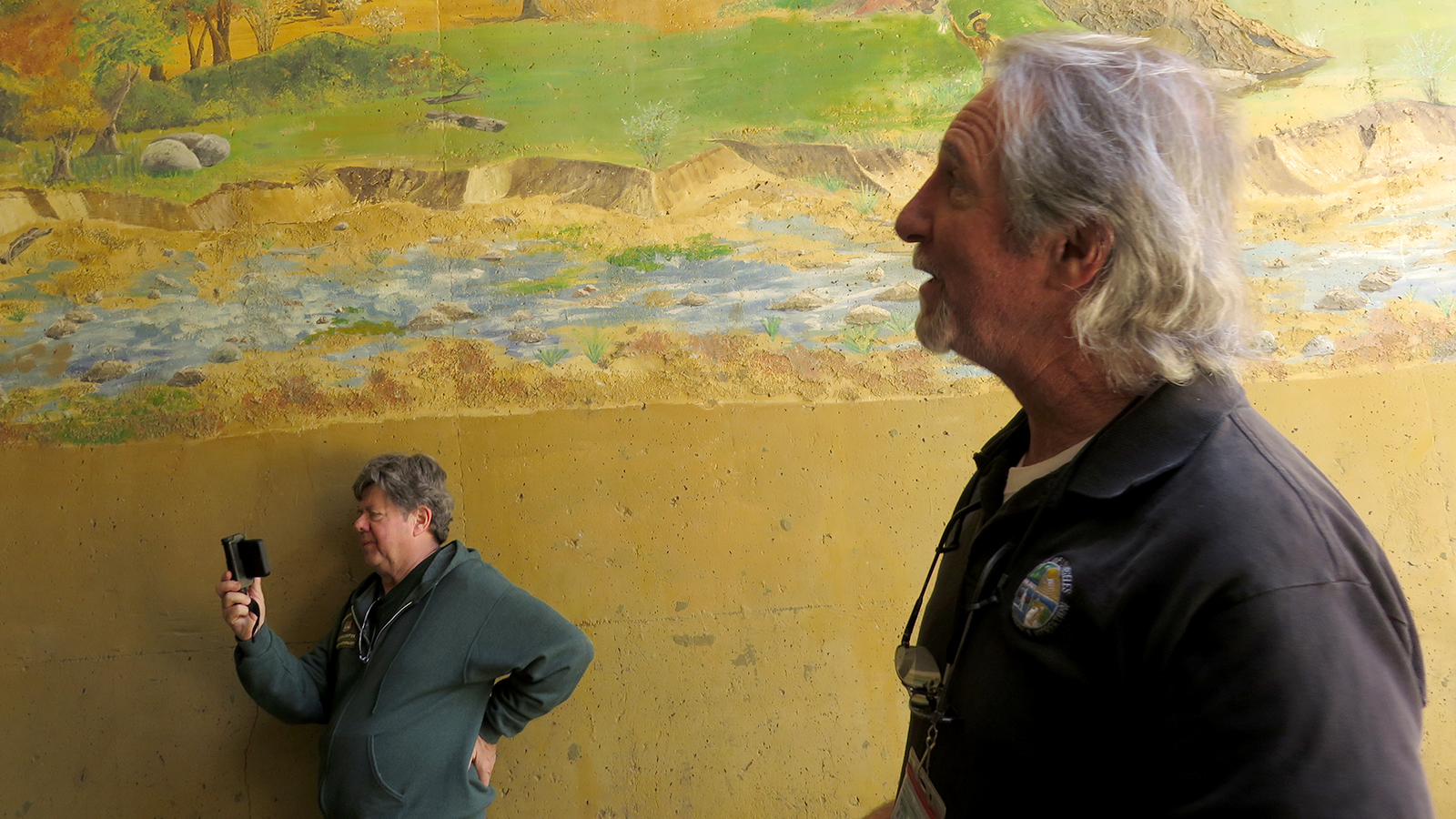 Uploaded 05/23/2016 Exactly 40 years after it was dedicated, the artist responsible for the mural next to the Oak of the Golden Dream returned to Placerita Canyon State Park to describe its features and explain how he did it. Rudolph “Rudy” Pavini, now 81, was working at the Placerita Canyon Nature Center as a naturalist when the Los Angeles County Parks Department persuaded him in 1976 to paint a mural on the walls of the flood-control channel where Placerita Canyon Road crosses Placerita Creek. The mural was to depict the history of the park. Pavini, who lives in Canyon Country, was neither a naturalist nor a historian by trade; he was an artist. Born in Massachusetts, Pavni attended art school in Boston and taught art for 25 years in elementary schools and after-school programs. So he researched the history of the area in the local library and decided to paint six panels, each representing a different point in history. Hiking along the trail from the Nature Center to the famous golden oak, viewers walk forward in time from pre-dawn of man through the arrival of Tataviam Indians, followed by the Spanish, Mexican and finally the American periods One of the best known features is Pavini’s depiction of Francisco Lopez and the nearby tree where legend tells us Lopez napped, dreamed of riches, and awoke to discover gold flakes clinging to the roots of some wild onions. A favorite among visiting schoolchildren is the last panel, which shows prospectors sitting around a morning campfire, preparing for another hard day’s work. It took Pavini three months to complete the mural, which was dedicated May 23, 1976. He said he was still leading schoolchildren on hikes while he worked on it; he occasionally enlisted their aid in painting lower portions of the mural while he worked on the upper portions, which required scaffolding. Addressing a group of several dozen Placerita Canyon Nature Center volunteers and county park staff members Monday, Pavini revealed some hidden secrets of the mural. Upon close inspection, the viewer will see that certain features are raised; Pavini used a polymer mixture with local sand to create the texture of the riverbed, and he used sawdust for the bark of the golden oak. Irregularities in pictures of boulders represent Native American petroglyphs, and the rider on horseback in a late-afternoon scene with a reddish orange sky is intended to be Francisco Lopez. By and large, the acrylic painting has withstood the ravages of time. Ranger Frank Hoffman said he has seen water to a 5-foot level in the channel during El Nino weather events, covering lower portions of the mural, which is only about three feet off the ground in certain places. Most of the mural is shielded from direct sunlight, and Pavini said he used a protective coating so it can be cleaned. For more information about the Placerita Canyon Nature Center, click here.