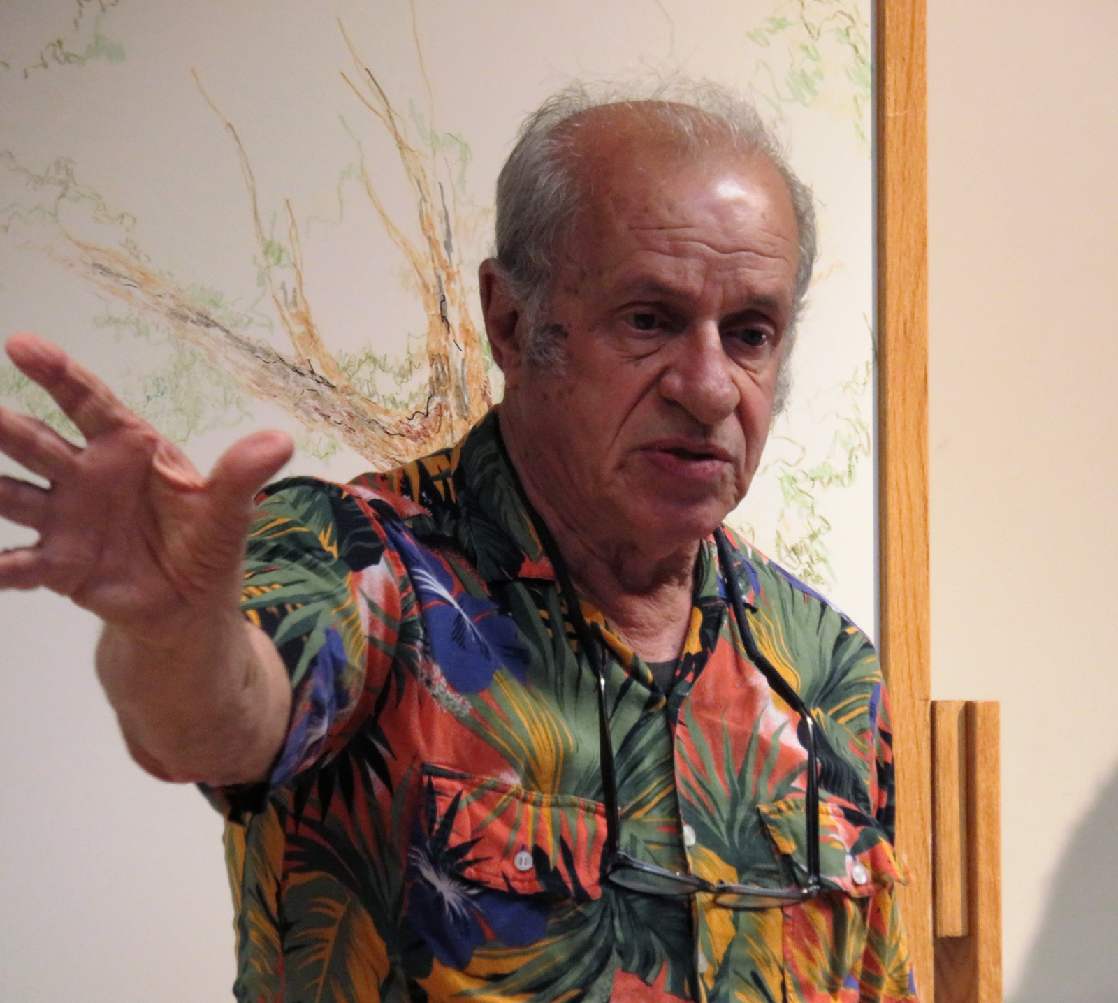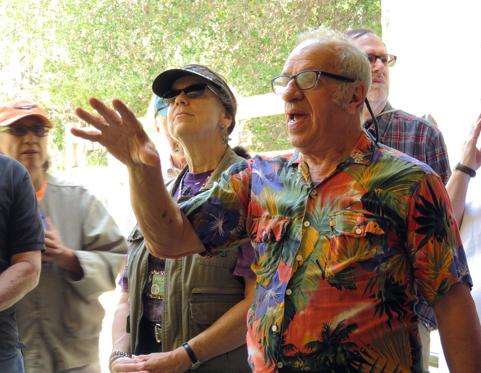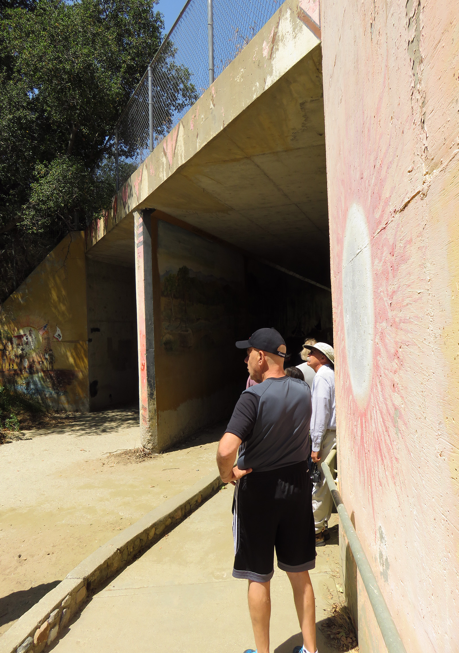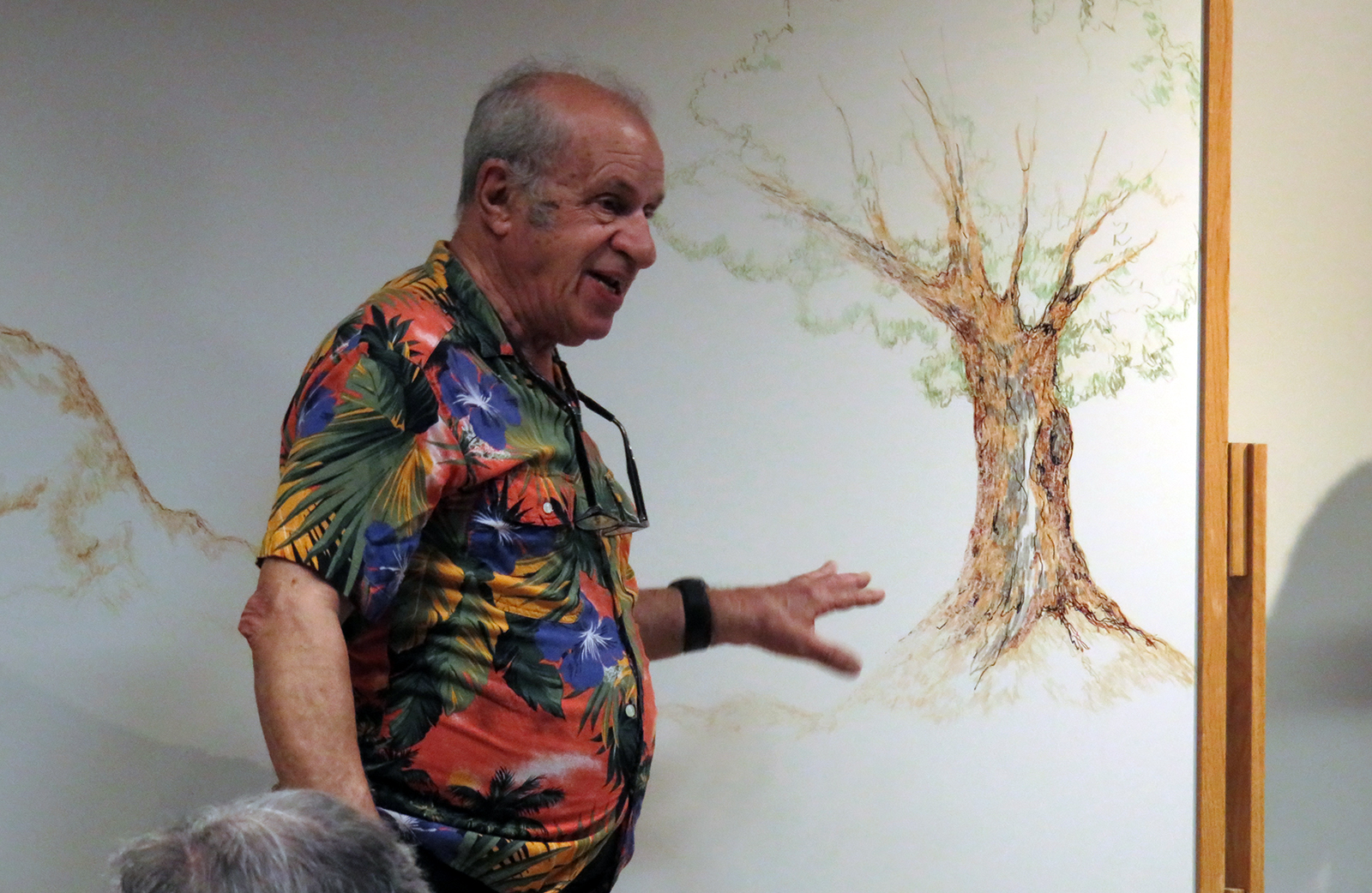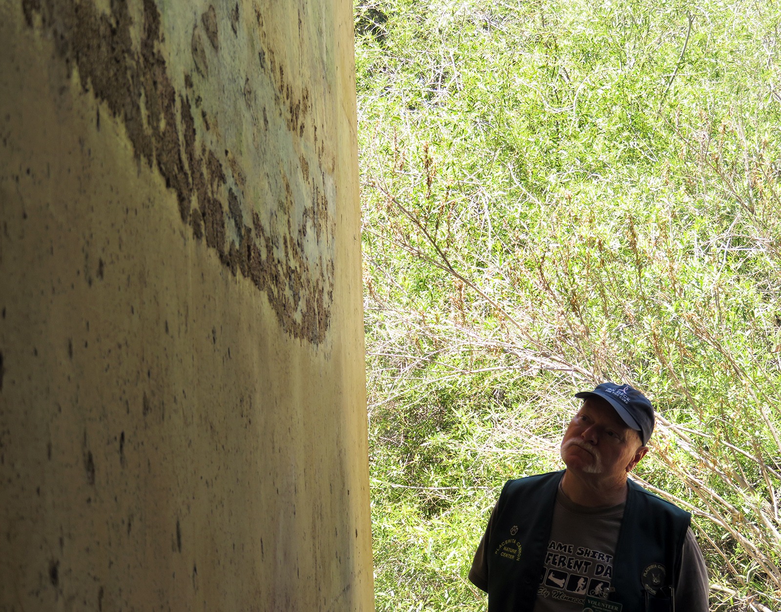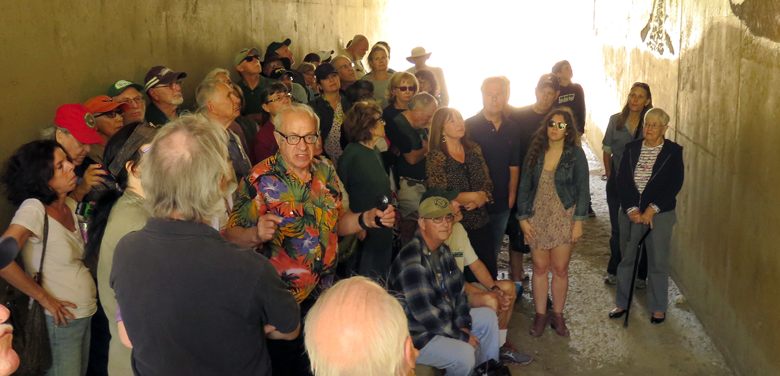 Uploaded 05/23/2016 Exactly 40 years after it was dedicated, the artist responsible for the mural next to the Oak of the Golden Dream returned to Placerita Canyon State Park to describe its features and explain how he did it. Rudolph “Rudy” Pavini, now 81, was working at the Placerita Canyon Nature Center as a naturalist when the Los Angeles County Parks Department persuaded him in 1976 to paint a mural on the walls of the flood-control channel where Placerita Canyon Road crosses Placerita Creek. The mural was to depict the history of the park. Pavini, who lives in Canyon Country, was neither a naturalist nor a historian by trade; he was an artist. Born in Massachusetts, Pavni attended art school in Boston and taught art for 25 years in elementary schools and after-school programs. So he researched the history of the area in the local library and decided to paint six panels, each representing a different point in history. Hiking along the trail from the Nature Center to the famous golden oak, viewers walk forward in time from pre-dawn of man through the arrival of Tataviam Indians, followed by the Spanish, Mexican and finally the American periods One of the best known features is Pavini’s depiction of Francisco Lopez and the nearby tree where legend tells us Lopez napped, dreamed of riches, and awoke to discover gold flakes clinging to the roots of some wild onions. A favorite among visiting schoolchildren is the last panel, which shows prospectors sitting around a morning campfire, preparing for another hard day’s work. It took Pavini three months to complete the mural, which was dedicated May 23, 1976. He said he was still leading schoolchildren on hikes while he worked on it; he occasionally enlisted their aid in painting lower portions of the mural while he worked on the upper portions, which required scaffolding. Addressing a group of several dozen Placerita Canyon Nature Center volunteers and county park staff members Monday, Pavini revealed some hidden secrets of the mural. Upon close inspection, the viewer will see that certain features are raised; Pavini used a polymer mixture with local sand to create the texture of the riverbed, and he used sawdust for the bark of the golden oak. Irregularities in pictures of boulders represent Native American petroglyphs, and the rider on horseback in a late-afternoon scene with a reddish orange sky is intended to be Francisco Lopez. By and large, the acrylic painting has withstood the ravages of time. Ranger Frank Hoffman said he has seen water to a 5-foot level in the channel during El Nino weather events, covering lower portions of the mural, which is only about three feet off the ground in certain places. Most of the mural is shielded from direct sunlight, and Pavini said he used a protective coating so it can be cleaned. For more information about the Placerita Canyon Nature Center, click here.