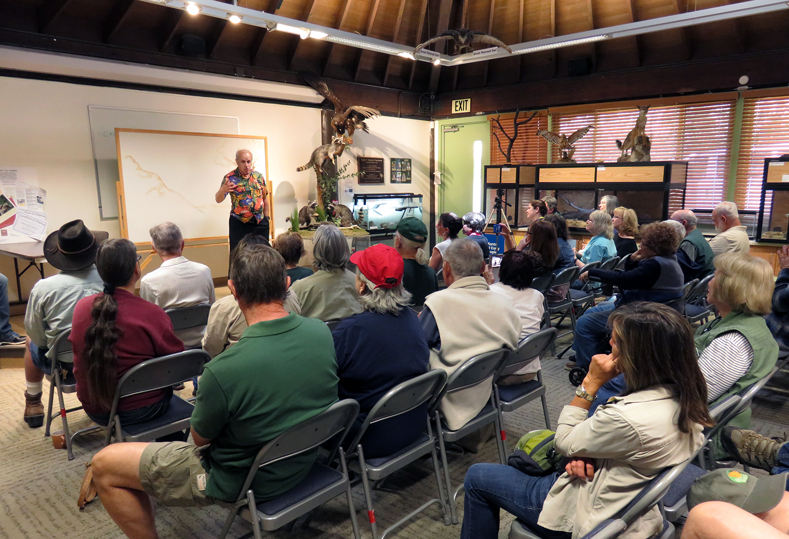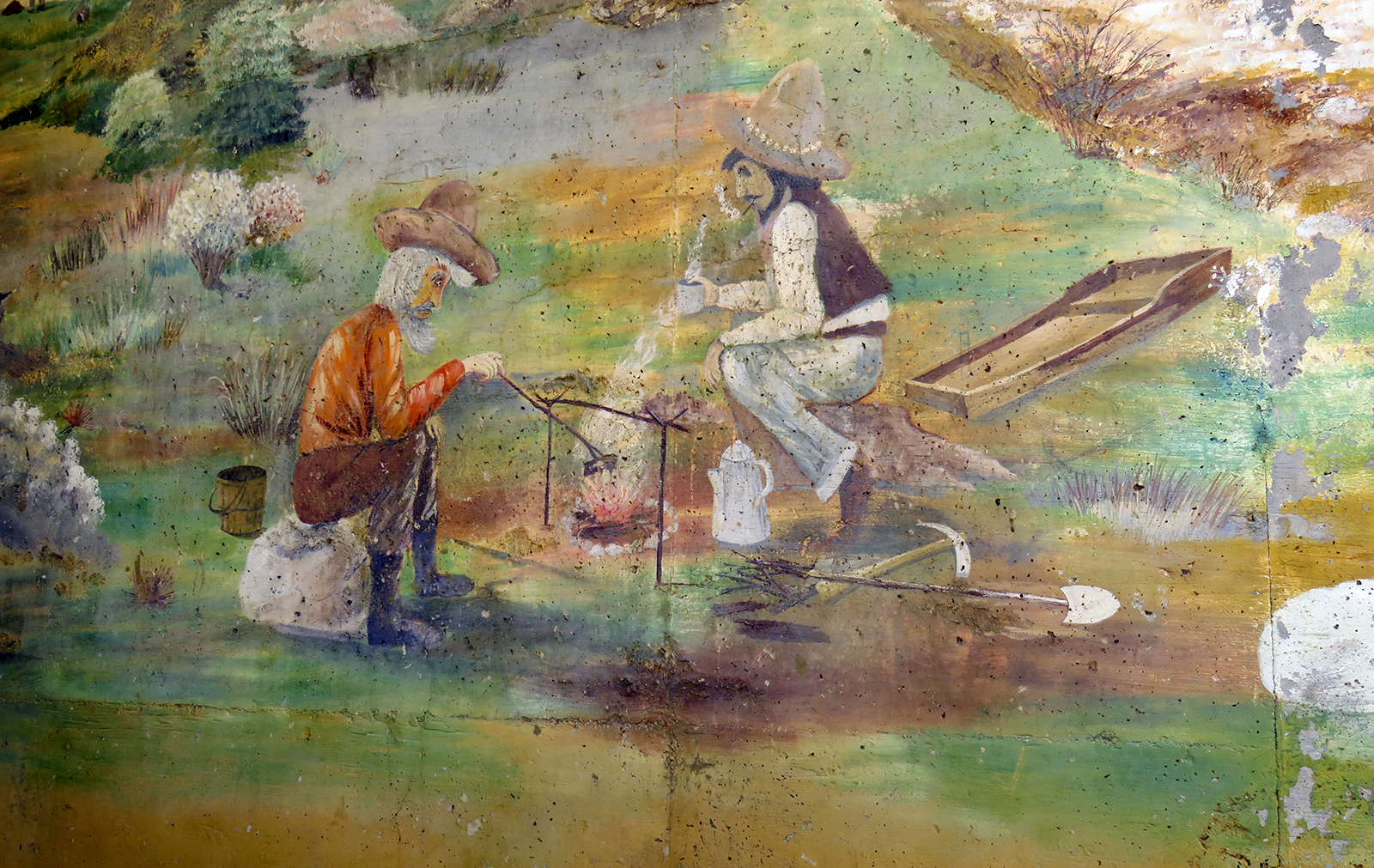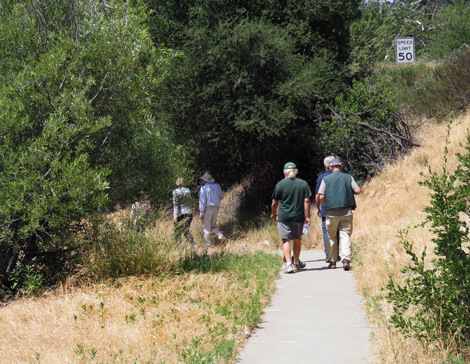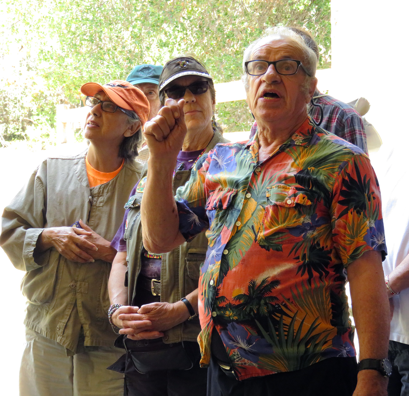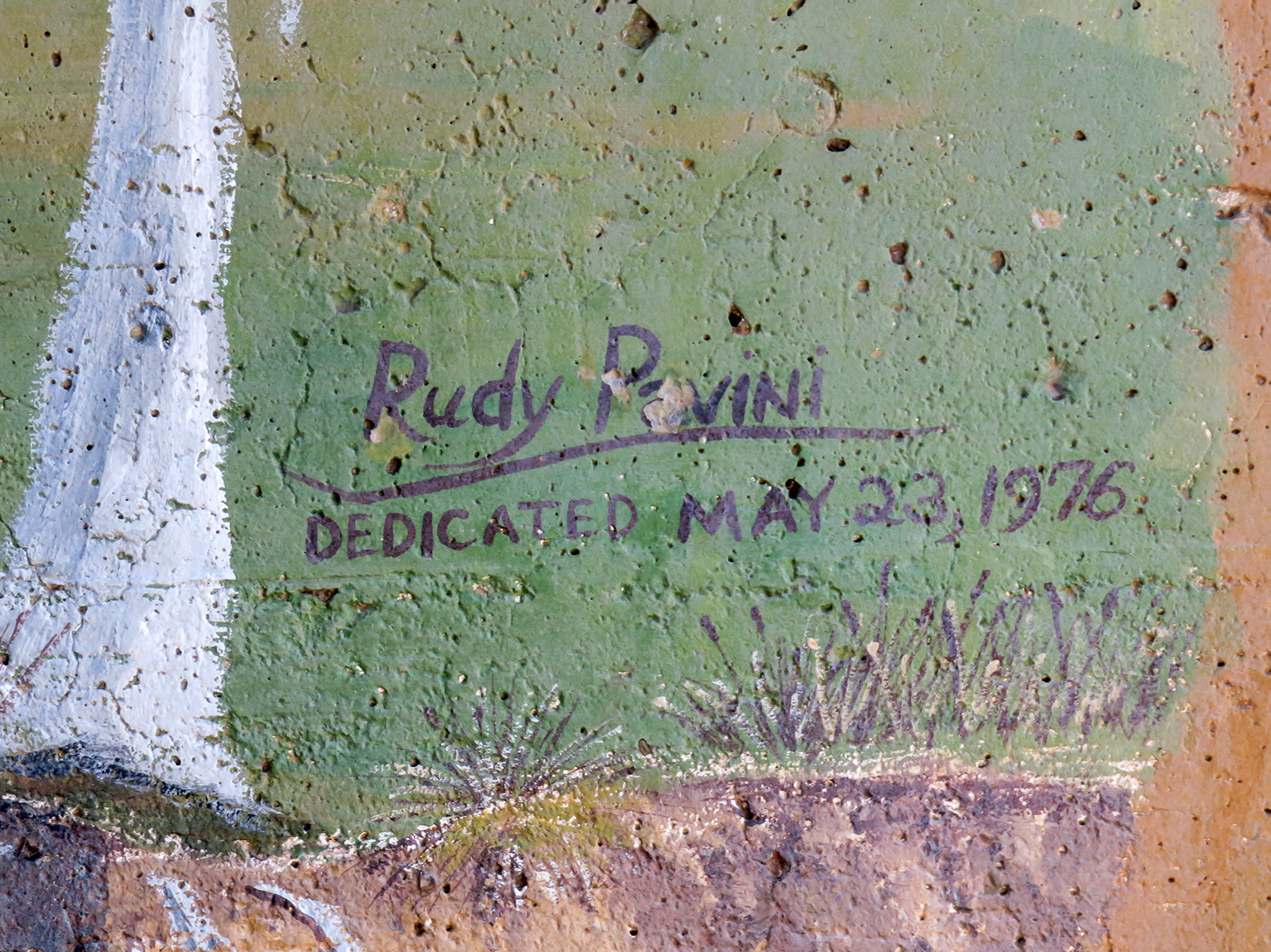 Uploaded 05/23/2016 Exactly 40 years after it was dedicated, the artist responsible for the mural next to the Oak of the Golden Dream returned to Placerita Canyon State Park to describe its features and explain how he did it. Rudolph “Rudy” Pavini, now 81, was working at the Placerita Canyon Nature Center as a naturalist when the Los Angeles County Parks Department persuaded him in 1976 to paint a mural on the walls of the flood-control channel where Placerita Canyon Road crosses Placerita Creek. The mural was to depict the history of the park. Pavini, who lives in Canyon Country, was neither a naturalist nor a historian by trade; he was an artist. Born in Massachusetts, Pavni attended art school in Boston and taught art for 25 years in elementary schools and after-school programs. So he researched the history of the area in the local library and decided to paint six panels, each representing a different point in history. Hiking along the trail from the Nature Center to the famous golden oak, viewers walk forward in time from pre-dawn of man through the arrival of Tataviam Indians, followed by the Spanish, Mexican and finally the American periods One of the best known features is Pavini’s depiction of Francisco Lopez and the nearby tree where legend tells us Lopez napped, dreamed of riches, and awoke to discover gold flakes clinging to the roots of some wild onions. A favorite among visiting schoolchildren is the last panel, which shows prospectors sitting around a morning campfire, preparing for another hard day’s work. It took Pavini three months to complete the mural, which was dedicated May 23, 1976. He said he was still leading schoolchildren on hikes while he worked on it; he occasionally enlisted their aid in painting lower portions of the mural while he worked on the upper portions, which required scaffolding. Addressing a group of several dozen Placerita Canyon Nature Center volunteers and county park staff members Monday, Pavini revealed some hidden secrets of the mural. Upon close inspection, the viewer will see that certain features are raised; Pavini used a polymer mixture with local sand to create the texture of the riverbed, and he used sawdust for the bark of the golden oak. Irregularities in pictures of boulders represent Native American petroglyphs, and the rider on horseback in a late-afternoon scene with a reddish orange sky is intended to be Francisco Lopez. By and large, the acrylic painting has withstood the ravages of time. Ranger Frank Hoffman said he has seen water to a 5-foot level in the channel during El Nino weather events, covering lower portions of the mural, which is only about three feet off the ground in certain places. Most of the mural is shielded from direct sunlight, and Pavini said he used a protective coating so it can be cleaned. For more information about the Placerita Canyon Nature Center, click here.