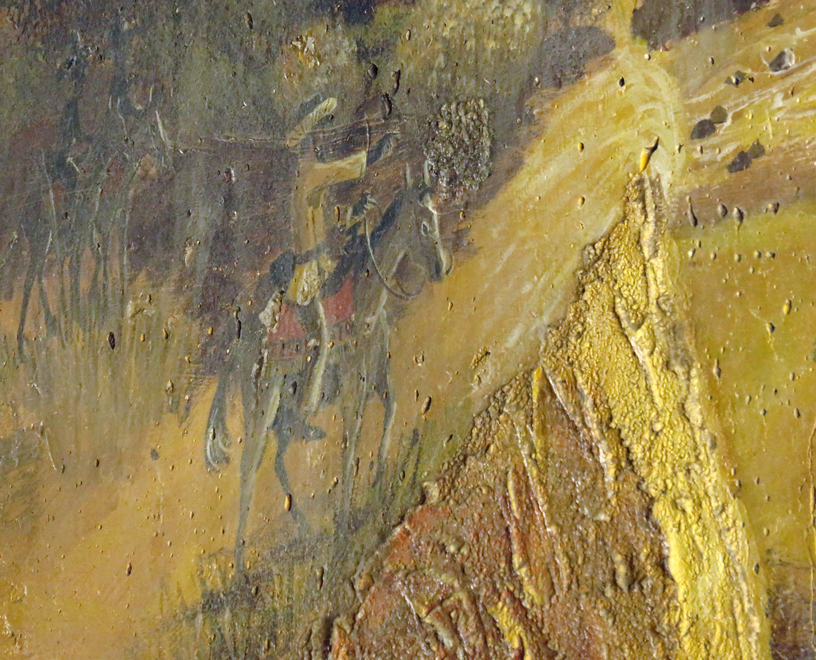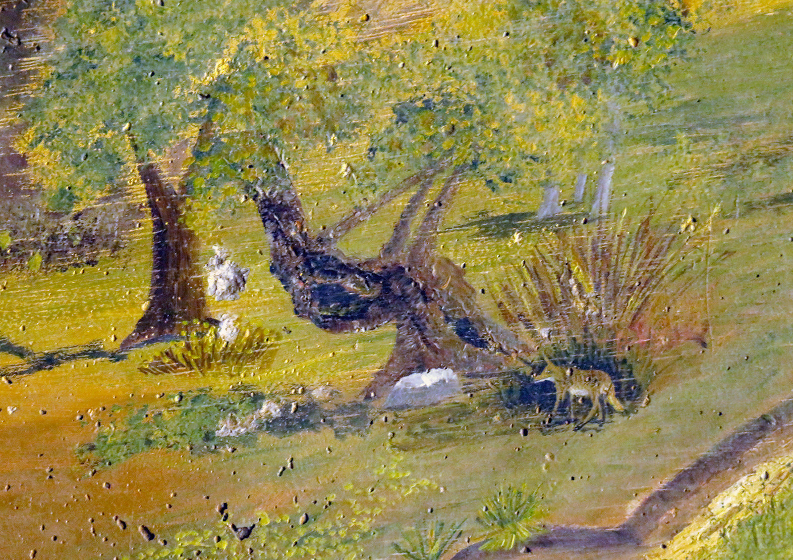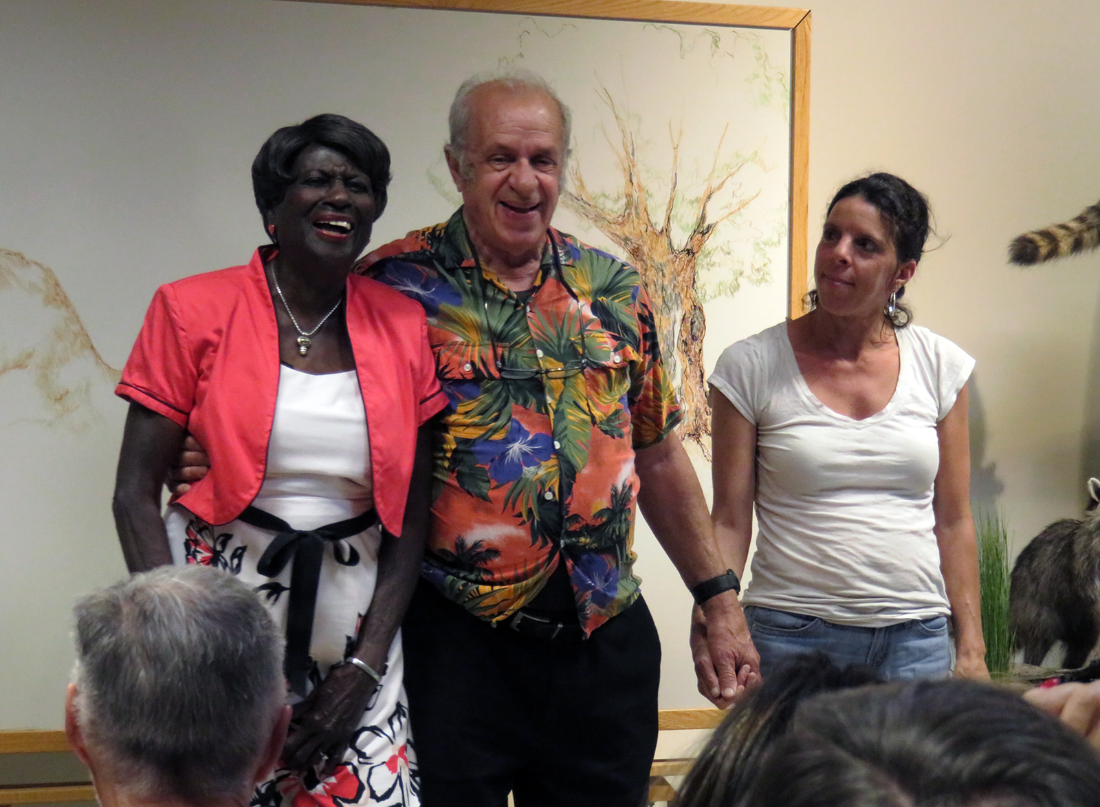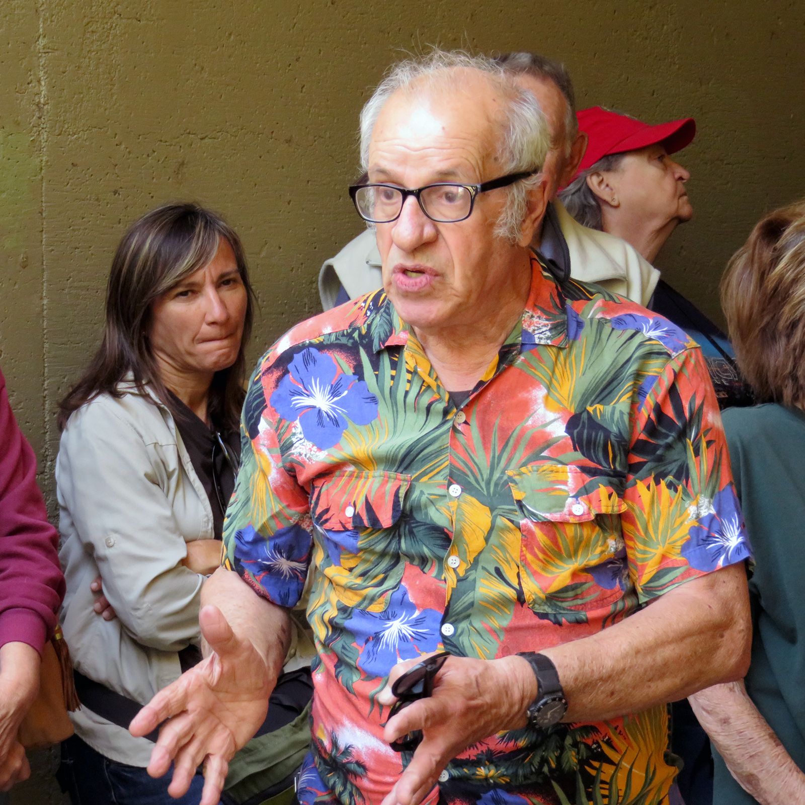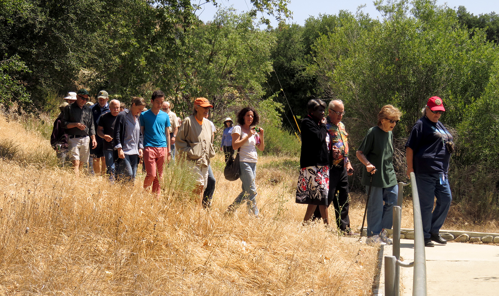 Uploaded 05/23/2016 Exactly 40 years after it was dedicated, the artist responsible for the mural next to the Oak of the Golden Dream returned to Placerita Canyon State Park to describe its features and explain how he did it. Rudolph “Rudy” Pavini, now 81, was working at the Placerita Canyon Nature Center as a naturalist when the Los Angeles County Parks Department persuaded him in 1976 to paint a mural on the walls of the flood-control channel where Placerita Canyon Road crosses Placerita Creek. The mural was to depict the history of the park. Pavini, who lives in Canyon Country, was neither a naturalist nor a historian by trade; he was an artist. Born in Massachusetts, Pavni attended art school in Boston and taught art for 25 years in elementary schools and after-school programs. So he researched the history of the area in the local library and decided to paint six panels, each representing a different point in history. Hiking along the trail from the Nature Center to the famous golden oak, viewers walk forward in time from pre-dawn of man through the arrival of Tataviam Indians, followed by the Spanish, Mexican and finally the American periods One of the best known features is Pavini’s depiction of Francisco Lopez and the nearby tree where legend tells us Lopez napped, dreamed of riches, and awoke to discover gold flakes clinging to the roots of some wild onions. A favorite among visiting schoolchildren is the last panel, which shows prospectors sitting around a morning campfire, preparing for another hard day’s work. It took Pavini three months to complete the mural, which was dedicated May 23, 1976. He said he was still leading schoolchildren on hikes while he worked on it; he occasionally enlisted their aid in painting lower portions of the mural while he worked on the upper portions, which required scaffolding. Addressing a group of several dozen Placerita Canyon Nature Center volunteers and county park staff members Monday, Pavini revealed some hidden secrets of the mural. Upon close inspection, the viewer will see that certain features are raised; Pavini used a polymer mixture with local sand to create the texture of the riverbed, and he used sawdust for the bark of the golden oak. Irregularities in pictures of boulders represent Native American petroglyphs, and the rider on horseback in a late-afternoon scene with a reddish orange sky is intended to be Francisco Lopez. By and large, the acrylic painting has withstood the ravages of time. Ranger Frank Hoffman said he has seen water to a 5-foot level in the channel during El Nino weather events, covering lower portions of the mural, which is only about three feet off the ground in certain places. Most of the mural is shielded from direct sunlight, and Pavini said he used a protective coating so it can be cleaned. For more information about the Placerita Canyon Nature Center, click here.