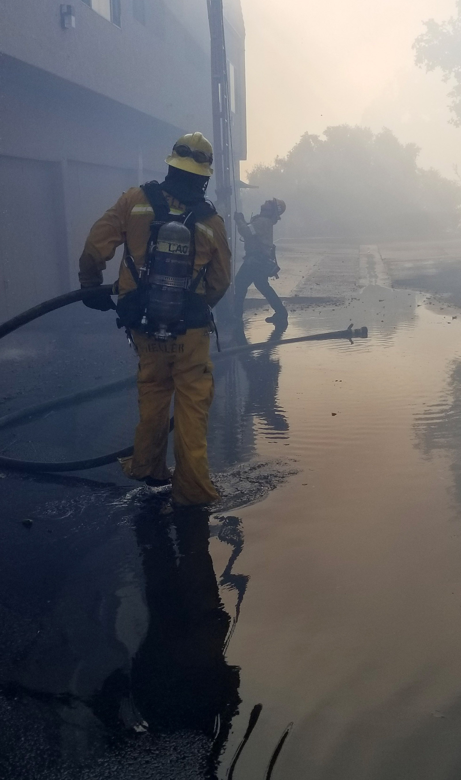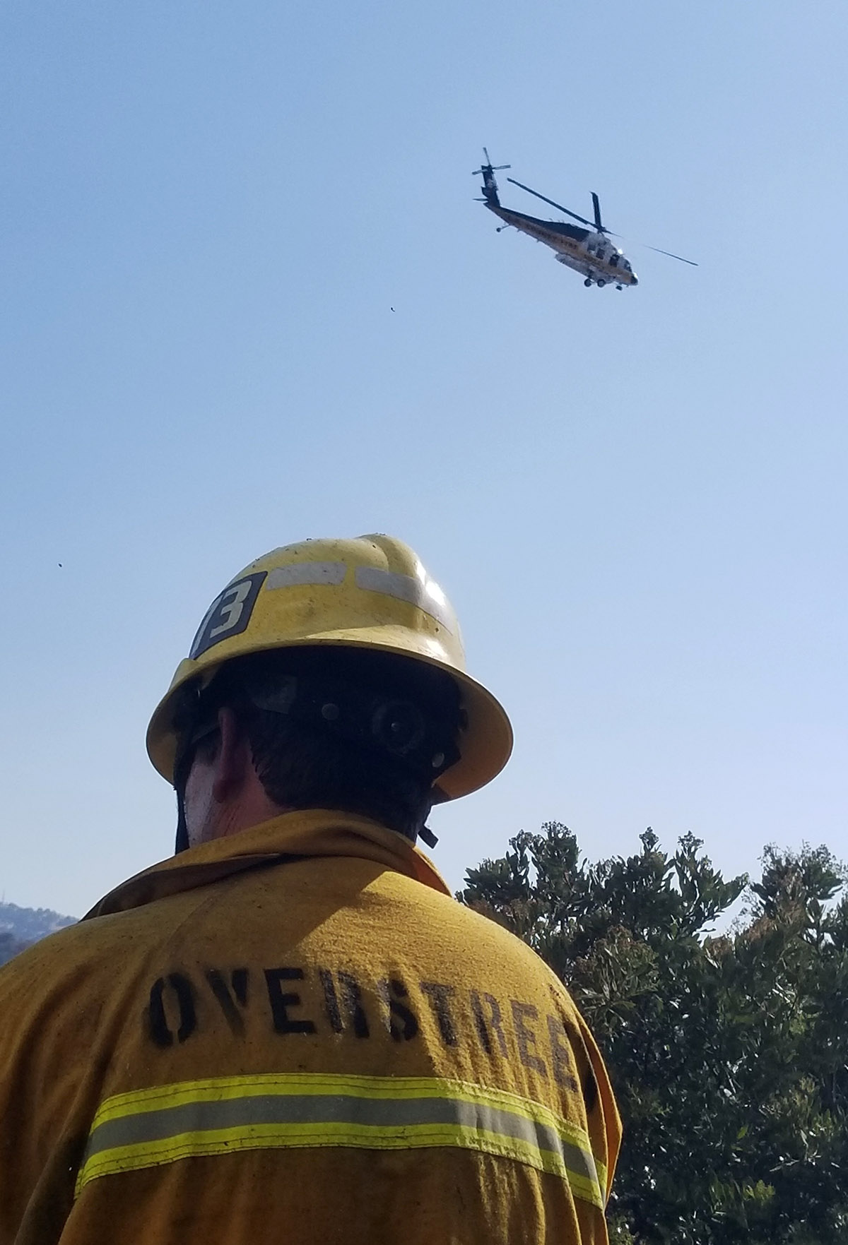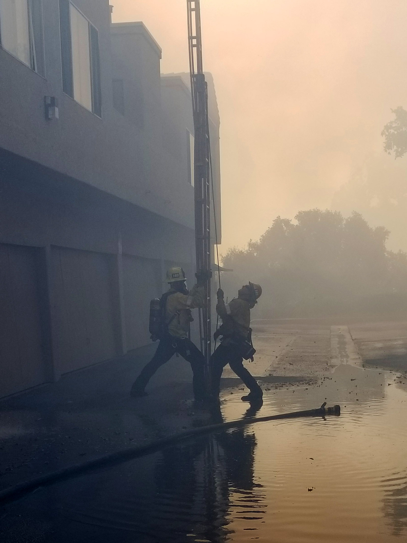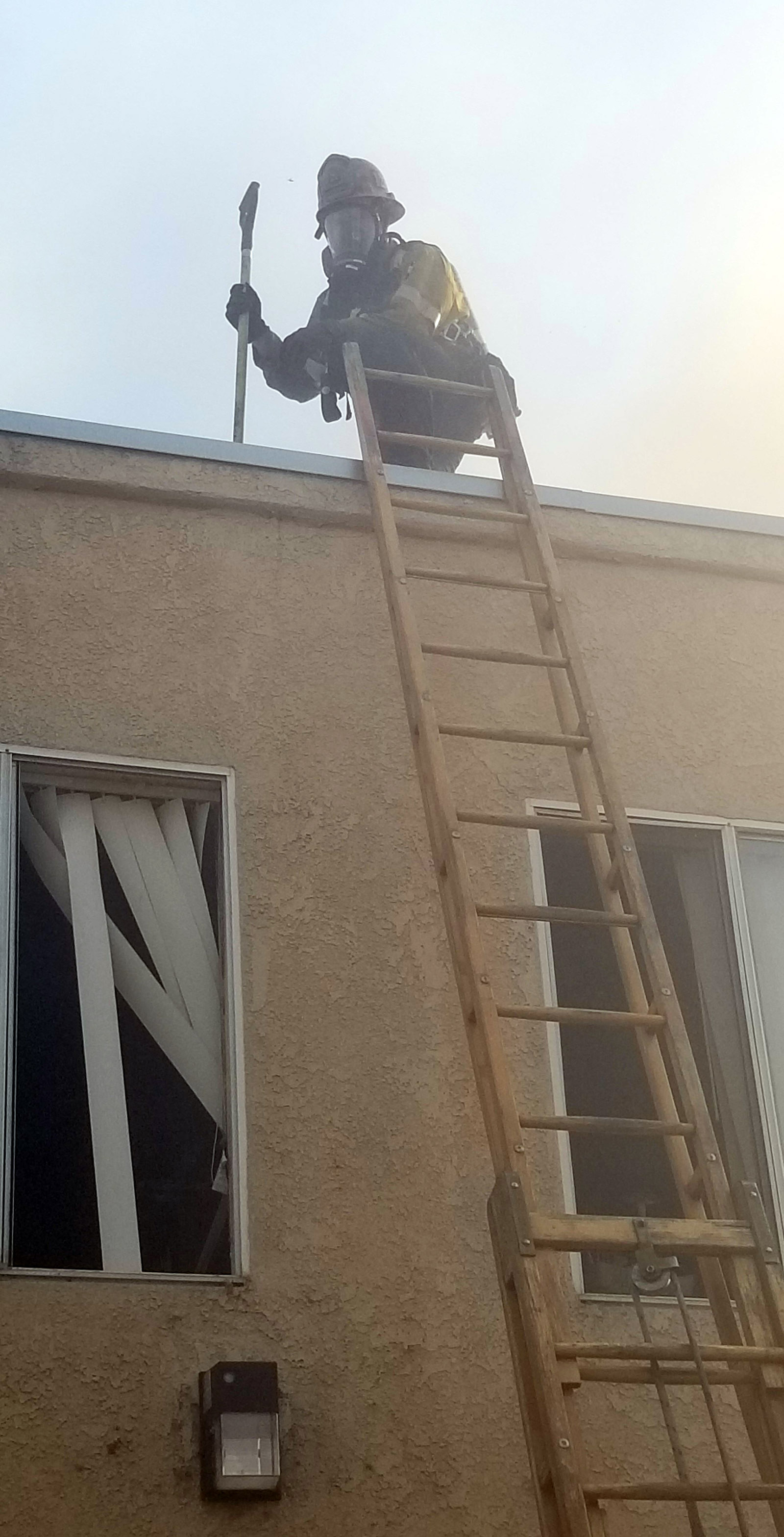 The fireman on the roof with the axe on the chainsaw was great. They all did a great job. The water drops really put it out on the hillside. It’s too bad it got into the apartments.