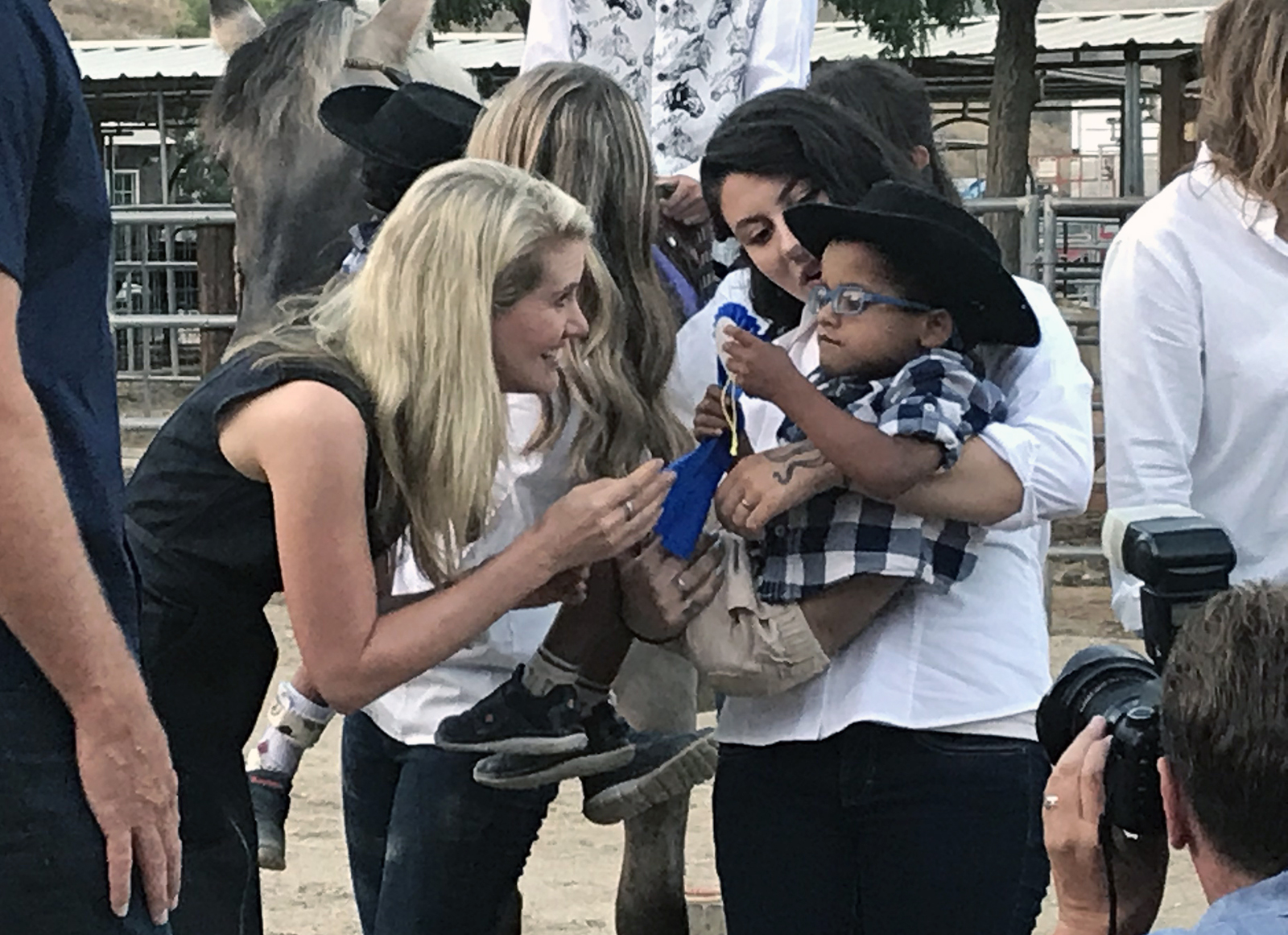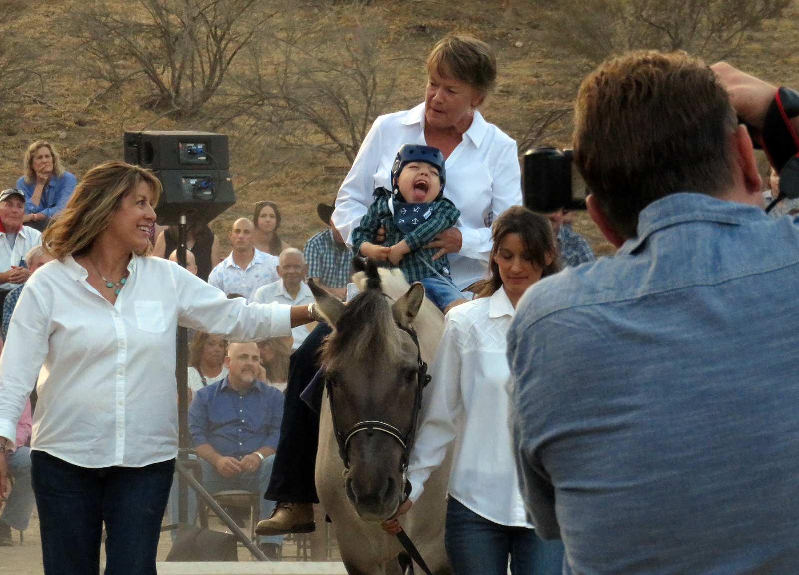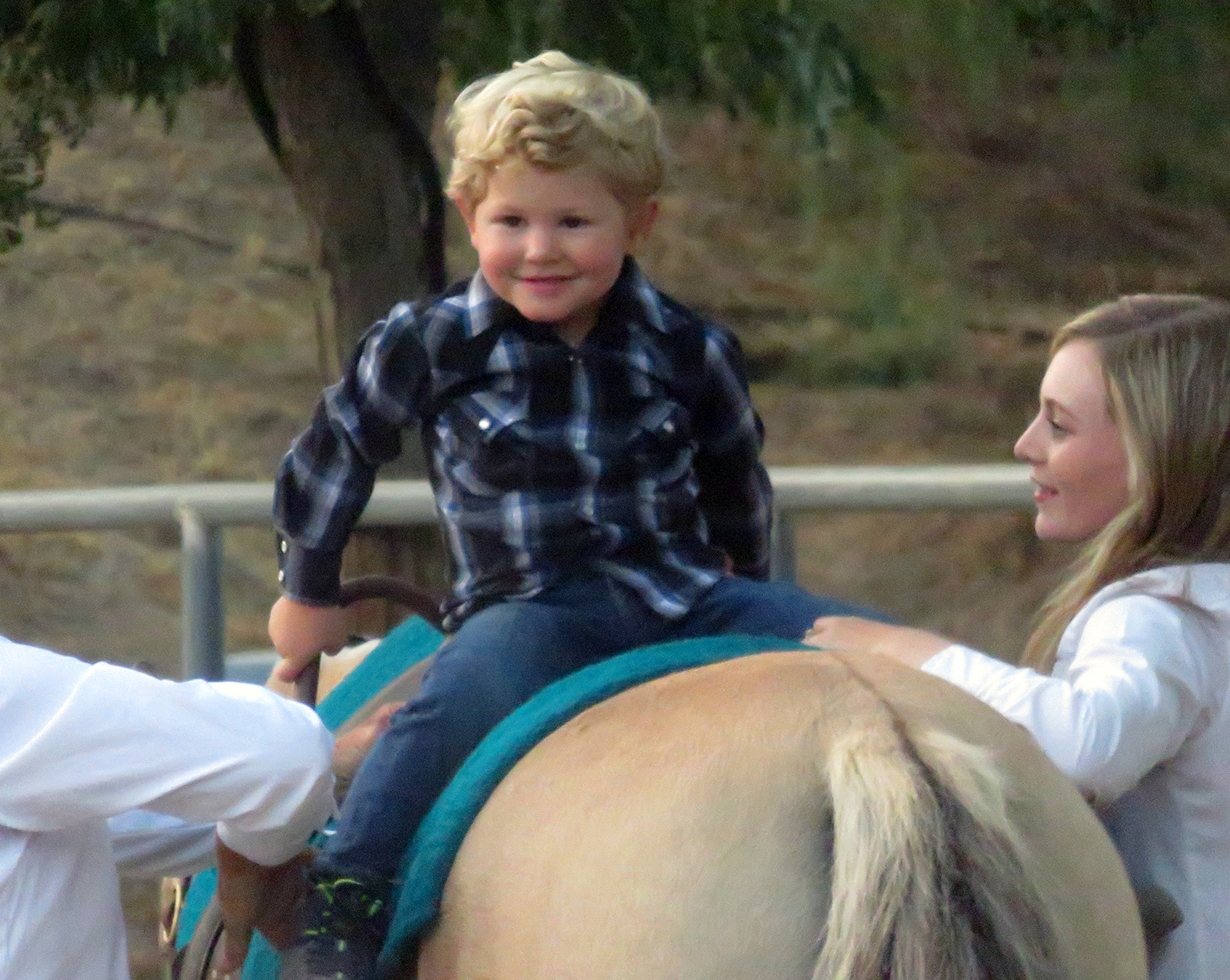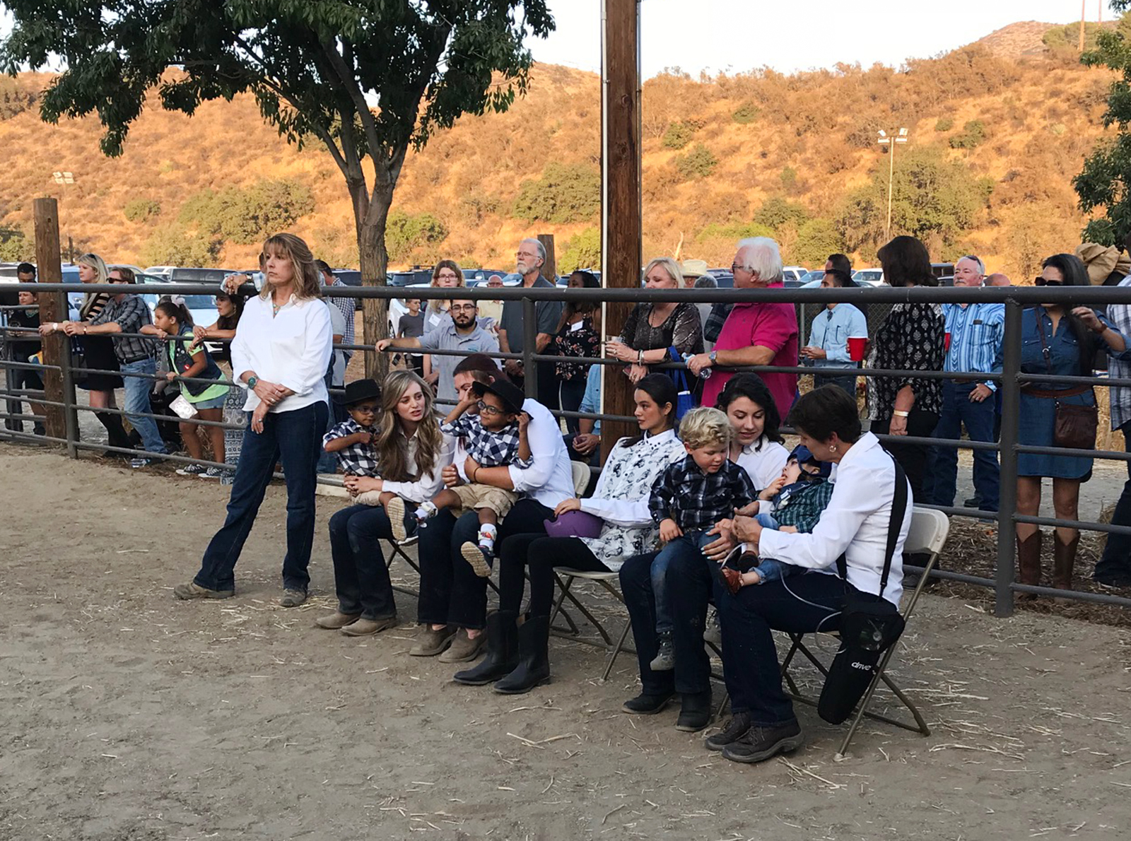 Earlier in the week, the Crawfords were invited to the ranch in Agua Dulce for the unveiling of a large sign atop the covered riding arena declaring the structure the “Crawford Family Arena.” “It was surprise,” said Redmond. “We were trying to come up with something to give to the Crawford family that would be meaningful, or significant.” Family patriarch Wayne Crawford said he was “overwhelmed” when he saw the sign. “If it wasn’t for the Crawford family, all of this wouldn’t exist,” said Redmond. “There wouldn’t be this facility, there wouldn’t be this arena, we couldn’t serve all these kids.” Crawford said the entire family has embraced Carousel Ranch. He said he still remembers the first time he saw a riding demonstration in 2001. “The work done by Carousel Ranch with kids just grabbed me the first time I saw a riding demonstration,” he said. “I was crying. It blew me away.” Daughter-in-law Jeanna Crawford took the Heart of the West event under her wing 14 years ago and transformed it into one of the Santa Clarita Valley’s “must attend” social events. It has raised more than $3.5 million to support the Carousel Ranch programs. “This event is so important for Carousel Ranch, it provides a third of our operating budget,” said Redmond. Jeanna and Kyle Crawford’s son, Caynen, 6, is a participant in the Carousel Ranch program. “No parent expects this to happen. We don’t plan for it,” said Jeanna Crawford. “The love we get here is immeasurable. It makes perfect sense that Caynen feels comfortable here because home is where the heart is, so this is where ours is.” Crawford son-in-law Eric Stroh has also given his time and talents to the Carousel Ranch cause. He served five years as president of the board and founded the Heart of the West Trap Shoot fundraiser, held each May at the Oak Tree Gun Club. “Carousel Ranch is a passion I’ve been proud of,” Stroh said. “Every time I see the kids have their lessons, it’s like the first time. It grabs your heart.”