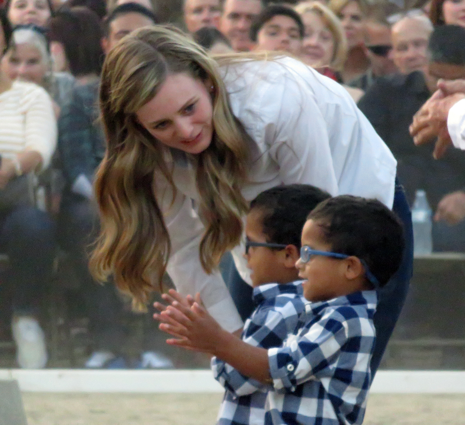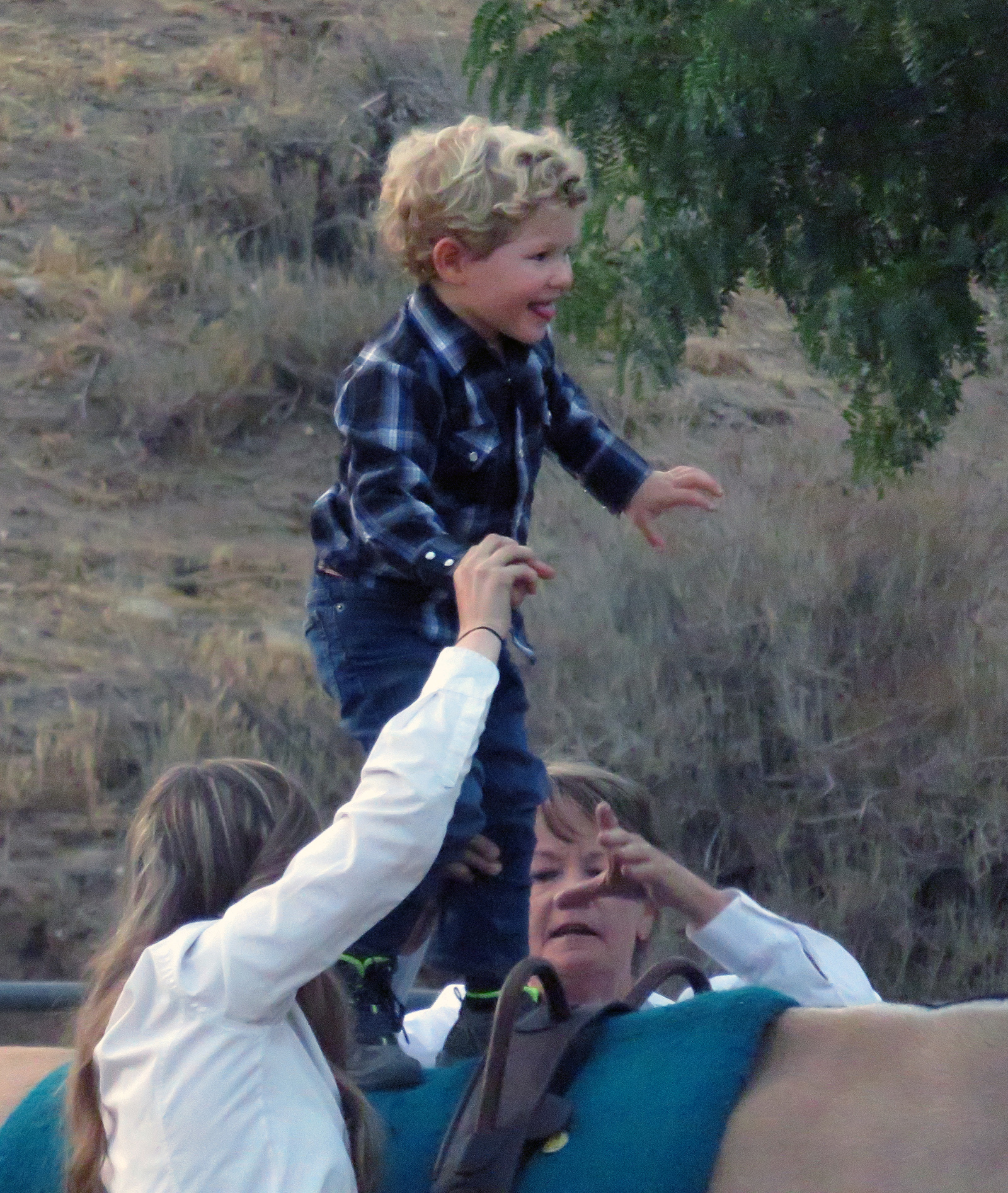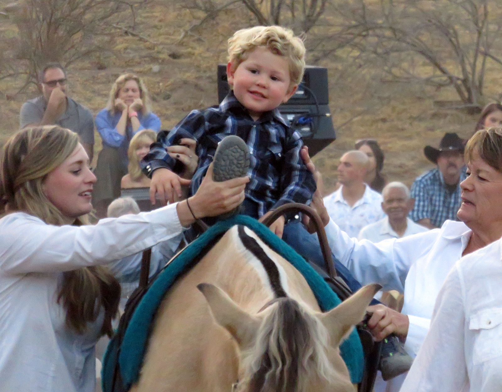 Earlier in the week, the Crawfords were invited to the ranch in Agua Dulce for the unveiling of a large sign atop the covered riding arena declaring the structure the “Crawford Family Arena.” “It was surprise,” said Redmond. “We were trying to come up with something to give to the Crawford family that would be meaningful, or significant.” Family patriarch Wayne Crawford said he was “overwhelmed” when he saw the sign. “If it wasn’t for the Crawford family, all of this wouldn’t exist,” said Redmond. “There wouldn’t be this facility, there wouldn’t be this arena, we couldn’t serve all these kids.” Crawford said the entire family has embraced Carousel Ranch. He said he still remembers the first time he saw a riding demonstration in 2001. “The work done by Carousel Ranch with kids just grabbed me the first time I saw a riding demonstration,” he said. “I was crying. It blew me away.” Daughter-in-law Jeanna Crawford took the Heart of the West event under her wing 14 years ago and transformed it into one of the Santa Clarita Valley’s “must attend” social events. It has raised more than $3.5 million to support the Carousel Ranch programs. “This event is so important for Carousel Ranch, it provides a third of our operating budget,” said Redmond. Jeanna and Kyle Crawford’s son, Caynen, 6, is a participant in the Carousel Ranch program. “No parent expects this to happen. We don’t plan for it,” said Jeanna Crawford. “The love we get here is immeasurable. It makes perfect sense that Caynen feels comfortable here because home is where the heart is, so this is where ours is.” Crawford son-in-law Eric Stroh has also given his time and talents to the Carousel Ranch cause. He served five years as president of the board and founded the Heart of the West Trap Shoot fundraiser, held each May at the Oak Tree Gun Club. “Carousel Ranch is a passion I’ve been proud of,” Stroh said. “Every time I see the kids have their lessons, it’s like the first time. It grabs your heart.”