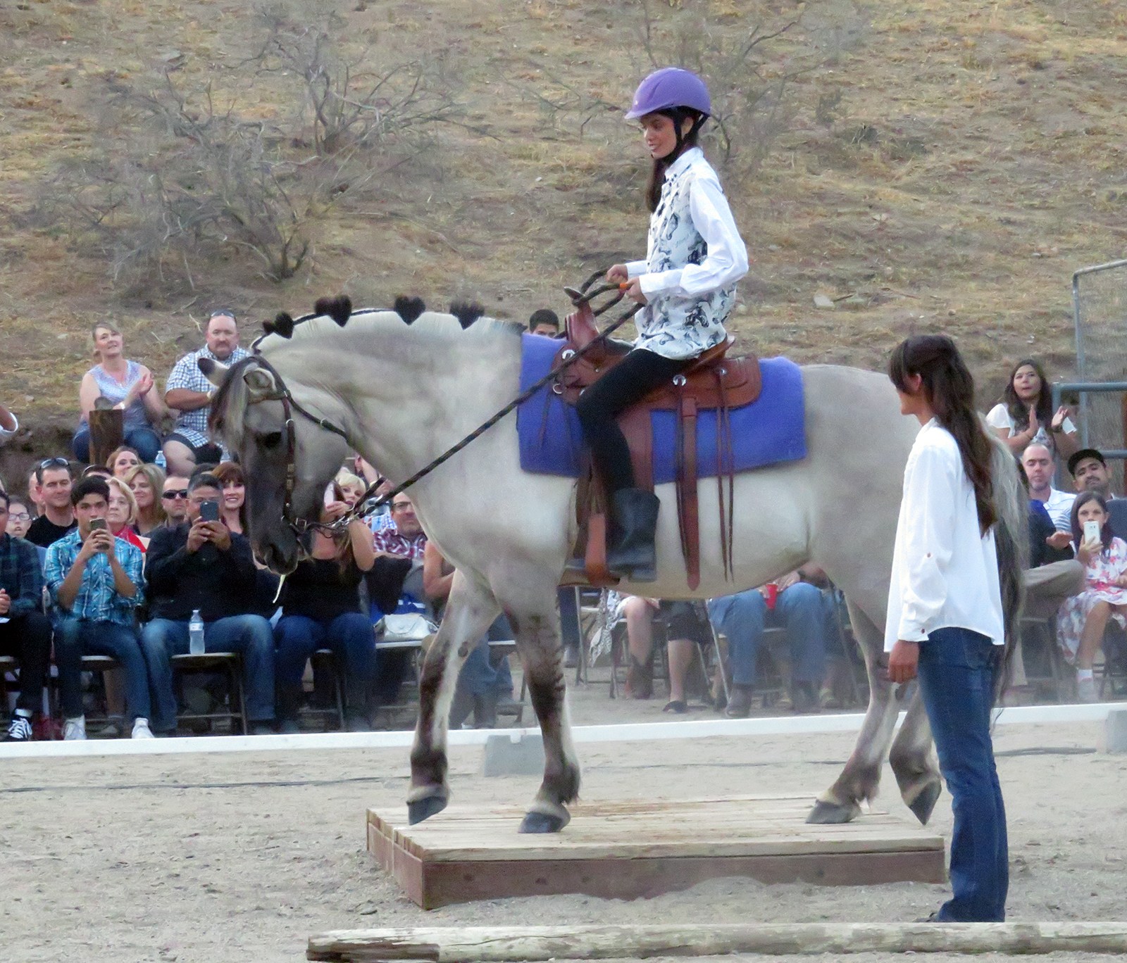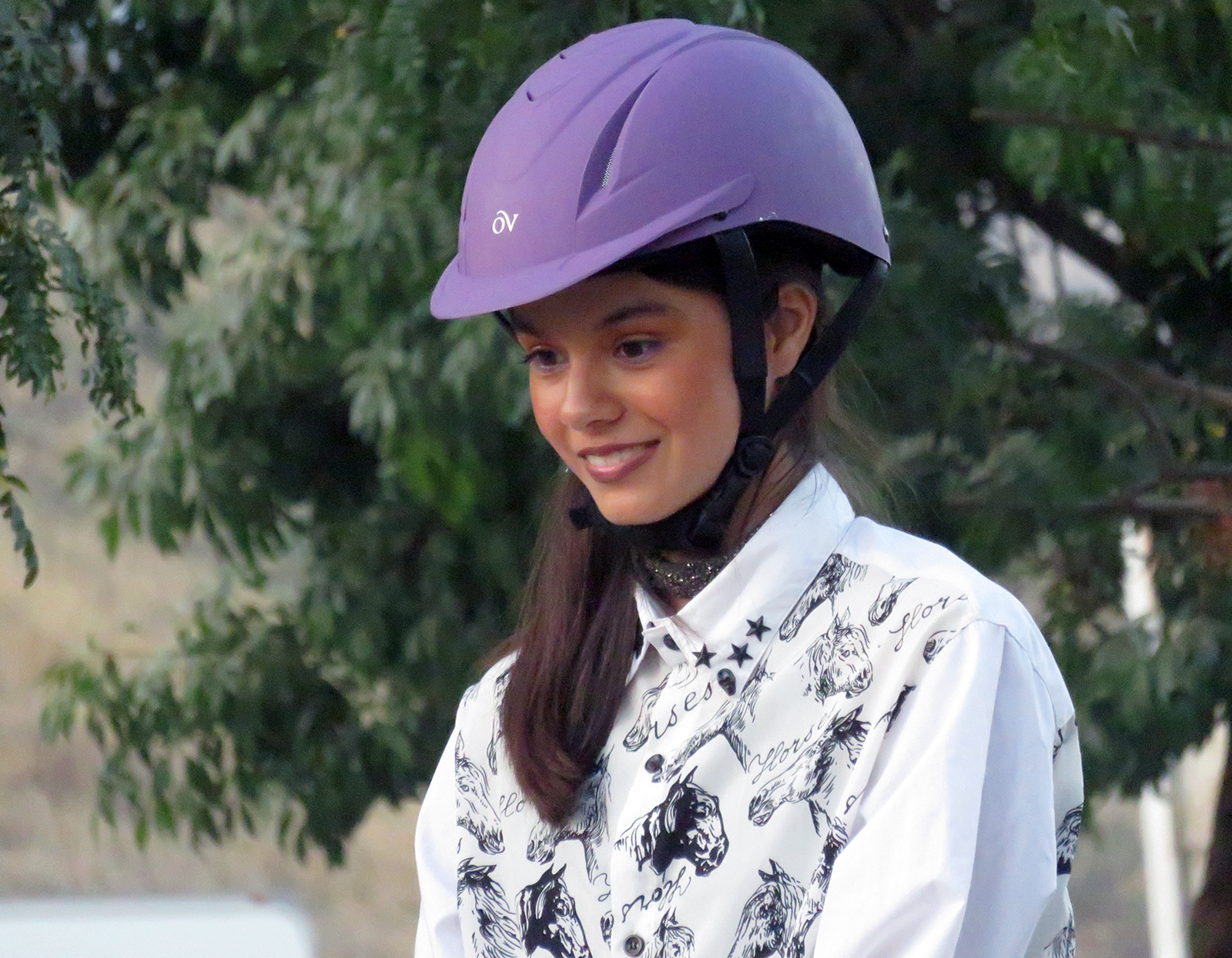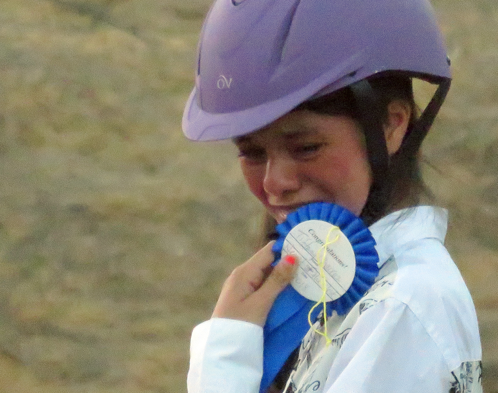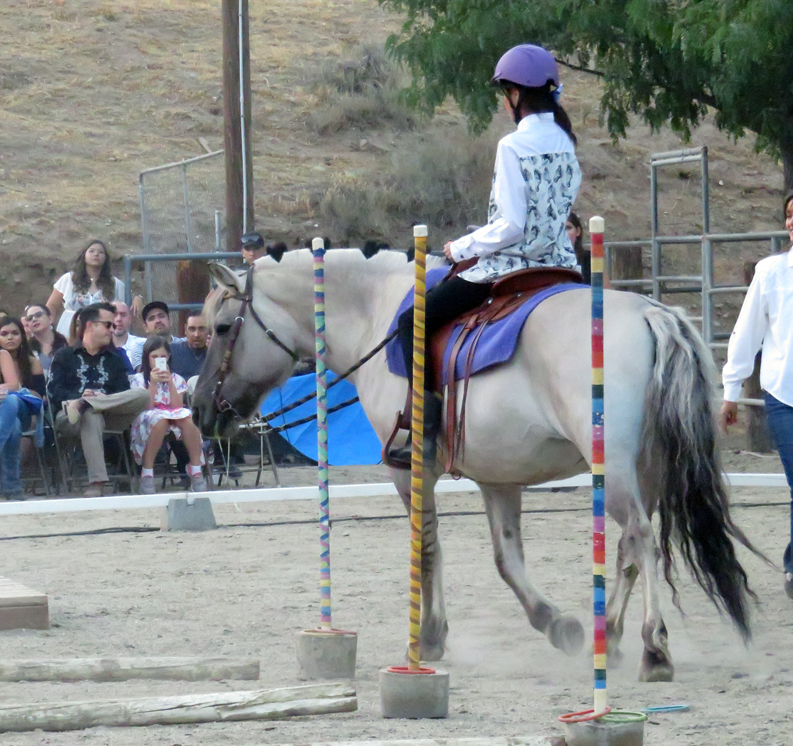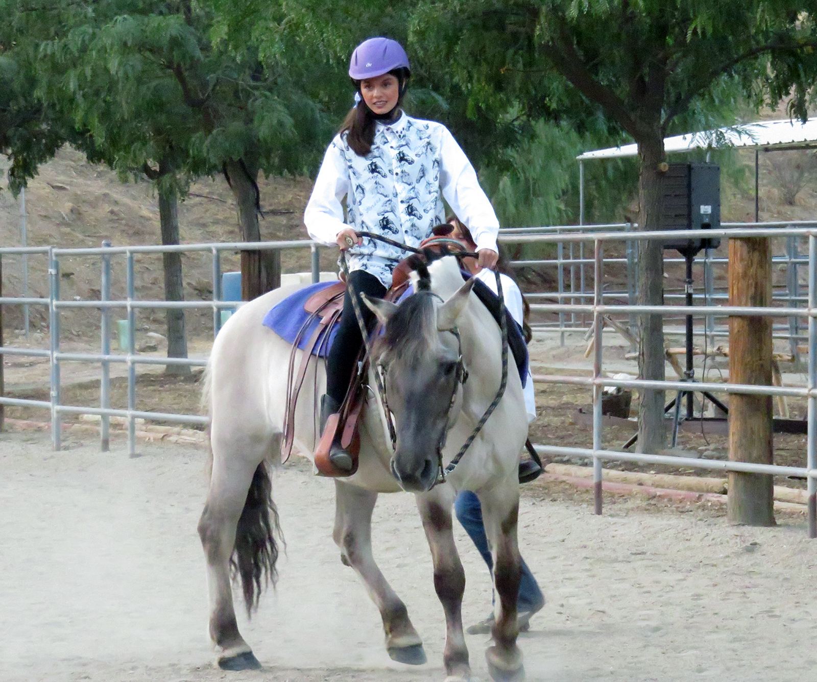 Ochoa, who has cerebral palsy, smiled as he held his arms out during his ride. Edwards said since Ochoa has started the therapy he is able to sit up a little stronger due to improved “trunk control.” “His mother said that what might seem like a small improvement to others is a huge milestone,” said Edwards. “I can just imagine what joy his parents must feel.” King started riding at Carousel Ranch for more than a year. He started attending the therapy to improve his balance and gait. He would routinely fall eight to 20 times a day. King has now improved to the point where he can run, jump, ride a trike and a scooter. “He has made so much progress,” said Edwards. The Thompson twins are recent additions to the Carousel Ranch family, having started therapy just a few months ago. David was born with autism, and his brother, Andrew, was diagnosed with club feet and epilepsy. The brothers rode together, one in front of the other, around the arena with a grand finale of Andrew standing up behind his brother on the horse. “These are brave, fearless and amazing boys,” said Edwards. Chairez, diagnosed with autism, has been riding at Carousel Ranch for more than a year. She confidently rode Annabelle solo around the arena guiding her mount around the obstacles laid out for the demonstration. “There is a lot to think about when riding a horse independently. Tiffany is learning multi-tasking skills as well as having the time of her life,” said Edwards. At the end of the demonstration, officials from the Princess Community Foundation handed out blue ribbons to all the riders.