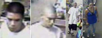 The suspects, depicted (here), allegedly enter the store and distract the clerk. One of the suspects allegedly ducks out of view and sneaks into the back storage room of the business where he unlocks a service door. The suspects allegedly return at a later time and steal property from the back storage room.