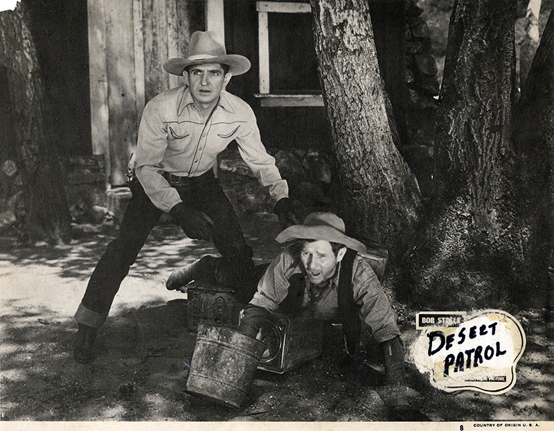 Bob Steele stands in front of Frank Walker's winter cabin (the cabin off the parking lot of today's Placerita Canyon Nature Center) in 1938's "Desert Patrol" from Republic Pictures.