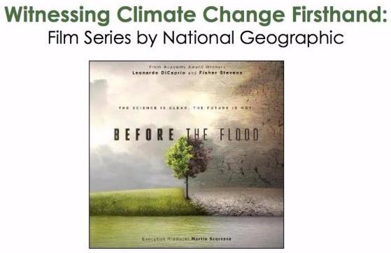 Climate Change Documentary Screenings in April  In honor of Earth Month, throughout the month of April, residents are invited to "Witnessing Climate Change Firsthand: Three Films by National Geographic," a series of free National Geographic documentary screenings.