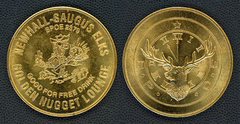 Think this is still good for a free drink? Brass token, 1½ inches, n.d. Good for one free drink at the Golden Nugget Lounge, Newhall-Saugus Elks Lodge, B.P.O.E. 2379. Depicts a cartoon prospector holding a large gold nugget with a cactus (saguaro?) in the background.