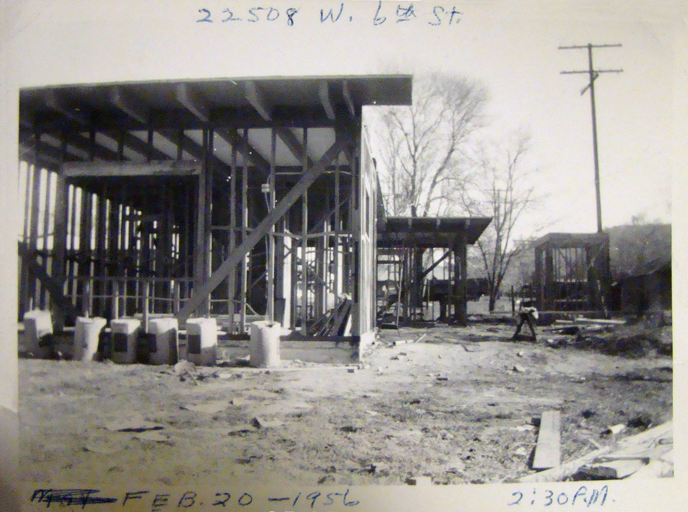 The Perkins Building under construction at 22508 W. 6th Street, Newhall, from February to May 1956.