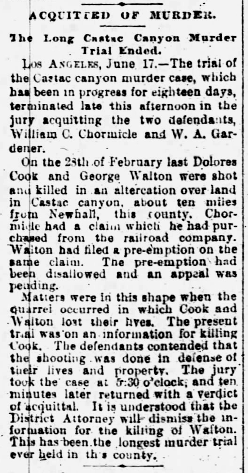 Today in SCV History: June 17, 1890 | Castaic Range War: 18-day murder trial of W.C. Chormicle and W.A. Gardner ends in acquittal. |