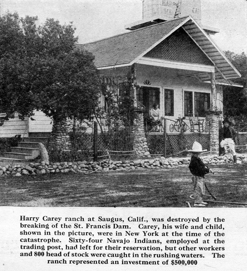 Actor Harry Carey's wood-framed house at Saugus ranch (now Tesoro del Valle) burns down when engine of water pump explodes.
