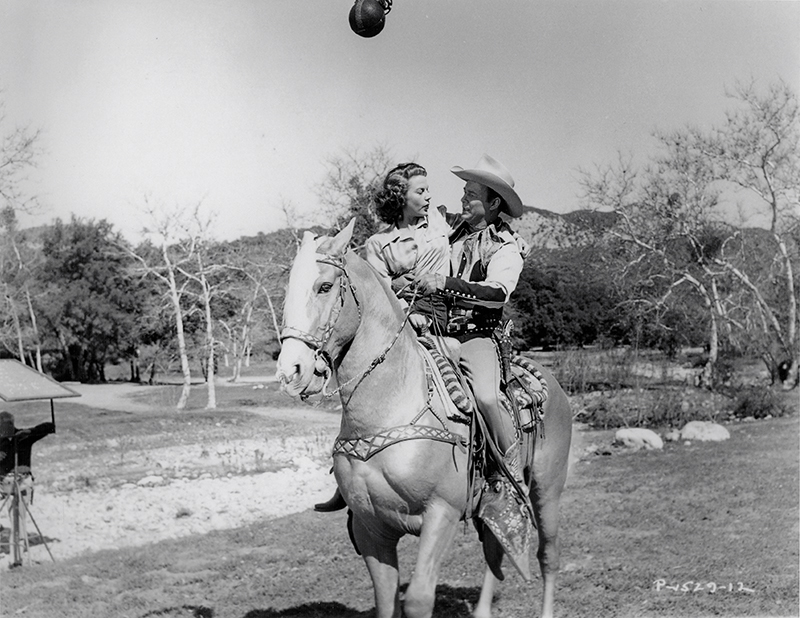 Roy Rogers and his wife, Dale Evans, and horse, Trigger, on a film shoot at the Walker Ranch in Placerita Canyon, probably late 1940s. Publicity photo to advertise a movie; unknown which one.