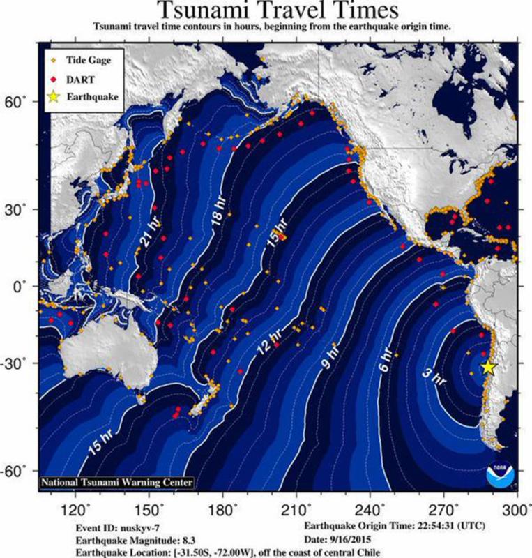 Chilean Quake Prompts Tsunami Warning for SoCal Beaches A Tsunami Advisory has been issued and remains in effect for the coastal areas of California from San Onofre State beach to Ragged Point (50 miles NW of San Luis Obispo). Start times estimated for the Los Angeles County beaches and harbors is 4:47 a.m., Thursday, Sept. 17. No land flooding is expected. |