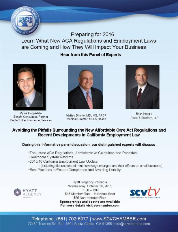 Oct. 14: What Your Business Needs to Know About Obamacare, Employment Law Learn from a panel of experts about the new Affordable Care Act regulations and changes in employment law that will affect your business. The annual Employment Law Update from the Santa Clarita Valley Chamber of Commerce is coming Wednesday, Oct. 14. |