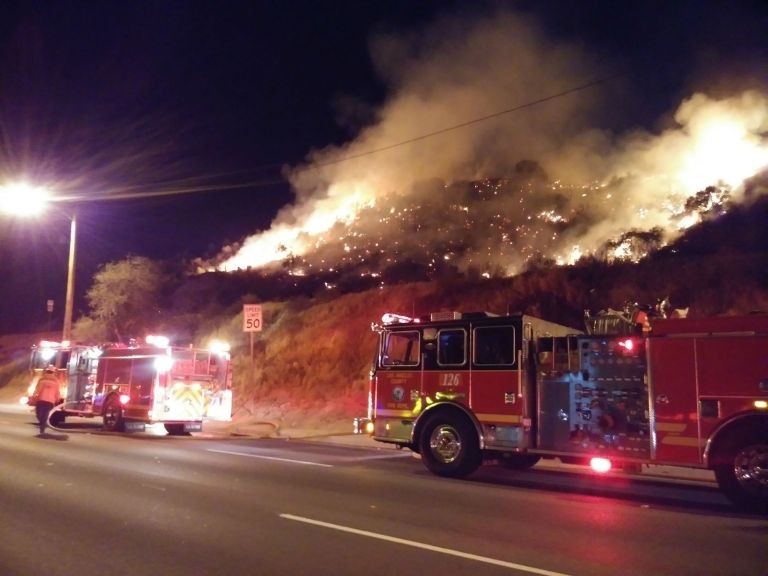 As kids went trick-or-treating for Halloween Wednesday night, Los Angeles County firefighters doused a two-acre brush fire near Bouquet Junction in Saugus.