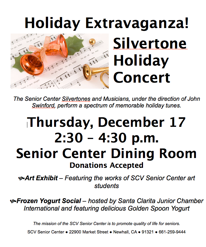 The Santa Clarita Valley Senior Center will be hosting a holiday concert featuring the Senior Center Silvertones and Musicians.