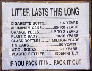 Litter Lasts Forever The Community Hiking Club has picked up over 1,000 lbs of micro-trash and litter this year. Many community organizations such as Girl Scouts, church groups, and Eagle Scouts have helped to achieve this goal. The photo below was taken in the Los Padres National Forest, and is a reminder to all of us not to leave ANYTHING behind. I've often been asked by many of you if it's okay to leave that banana peel behind. Check out this small list of items…..it will give you an idea of how long it takes for some of these "organic" items to decompose. Remember, if you bring it in, haul it out. And if you didn't bring it in, haul it out anyway. Thanks to all of you for everything you brought out of the forest this year. You've made Mother Earth smile!