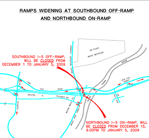 The northbound I-5 freeway on-ramp closure will begin at 9 p.m. on December 15, 2008. Both southbound I-5 off-ramp and northbound I-5 on-ramp are anticipated to re-open by January 5, 2009.