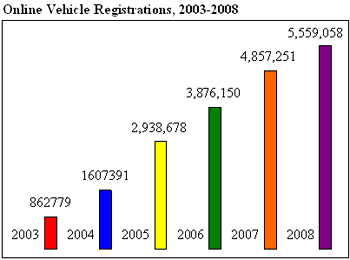 Vehicle registrations remain the most popular online option, as 5,577,328 vehicles were registered through the DMV website, a 14.8 percent increase over the 2007 total of 4,857,251. June and July were busy months for online vehicle registrations surpassing 500,000 transactions twice for the first time since the 2003 inception of the online program.