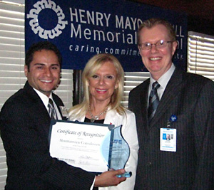 Vivian Rayburn, RN, director of case management, and John Schleif, senior vice president and chief operating officer (right) present George Vergara, director of business development at Mountain View Convalescent Hospital (left) with a certificate of recognition for his commitment to providing compassionate care to Henry Mayo patients and their families.