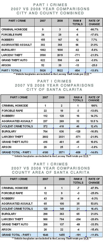 The Santa Clarita Valley Sheriff's Station is pleased to announce the release of the 2008 Part I crime statistics. Major crimes, categorized as Part I crimes, showed a significant overall reduction for the entire Santa Clarita Valley, reaching levels not seen since 2004.