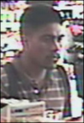The man is described as an Hispanic male, 25-30 years old, 5'08"-5'10" tall, 160-180 lbs., dark hair, mustached, short goatee, and bushy eyebrows. The suspect was wearing a brown collared shirt with white stripes.