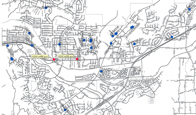 Incident: Monday, December 15, 2008, 5:30 p.m. Canyon Country: Despite a recent arrest, the investigation is continuing into several incidents of air gun related vandalism and assaults after yet another occurrence last night. Detectives have been investigating as many as 26 incidents dating back to November 01, 2008. During several of the incidents the windows of vehicles were apparently shot out by suspects wielding BB or pellet guns, and in one incident a 13-year-old girl was shot with a BB gun as she was sitting at a bus stop near Soledad Canyon Road and Crossglade Avenue, Canyon Country on December 03, 2008 at 8:30 a.m. (-ref 21490). The girl sustained a puncture wound on her arm, but was not seriously injured during the attack. She reported seeing a tan 4-door vehicle drive by. Nearly all the crimes have occurred in the Canyon Country area as identified on the map below.