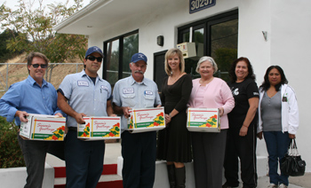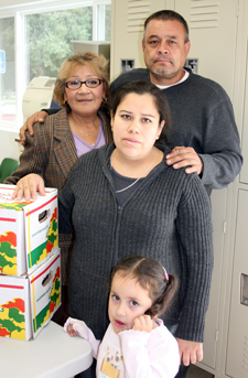 Above, from left: Ed Masterson, field representative to Assemblyman Cameron Smyth; Chris Saenz, Valencia Water Company; Jerold Graves, Valencia Water Company; Beverly Johnson, Valencia Water Company; Jackie Bick, field representative to Senator George Runner; Beverly Ramirez, SDFHC volunteer; and Balvina Ortiz, one of the SDFHC patients who received a turkey. RIGHT, clockwise: Arleen Hernandez, SDFHC outreach coordinator; SDFHC patients Sergio, Veronica and Vanessa Lopez, who received a turkey from Operation Gobble.